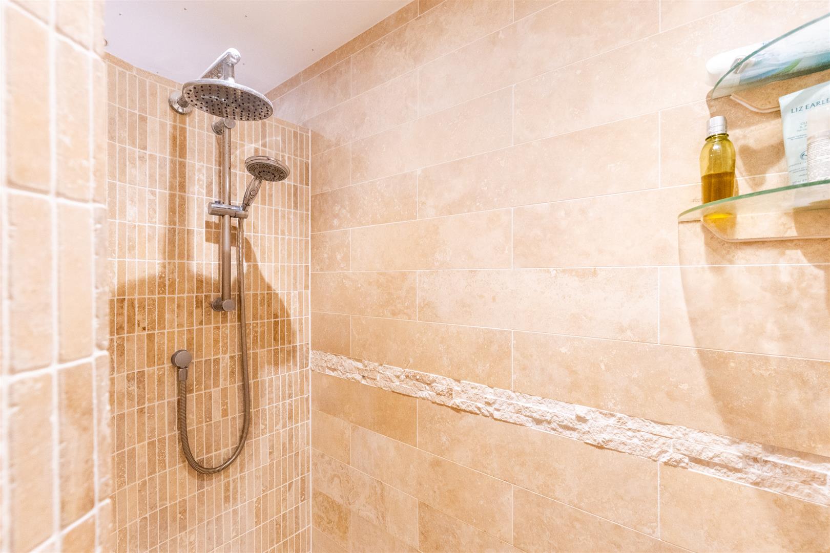 Dimensions: 2.95m x 2.39m (9'8" x 7'10"). White suite comprising panel bath, low flush W/C and vanity unit with inset hand basin, walk in shower cubicle with rain head shower and hand held shower, tiled floor, fully travertine tiled walls, inset mirror fitting, mood lighting, shaver point, double glazed roof light, underfloor heating, radiator/towel rail.