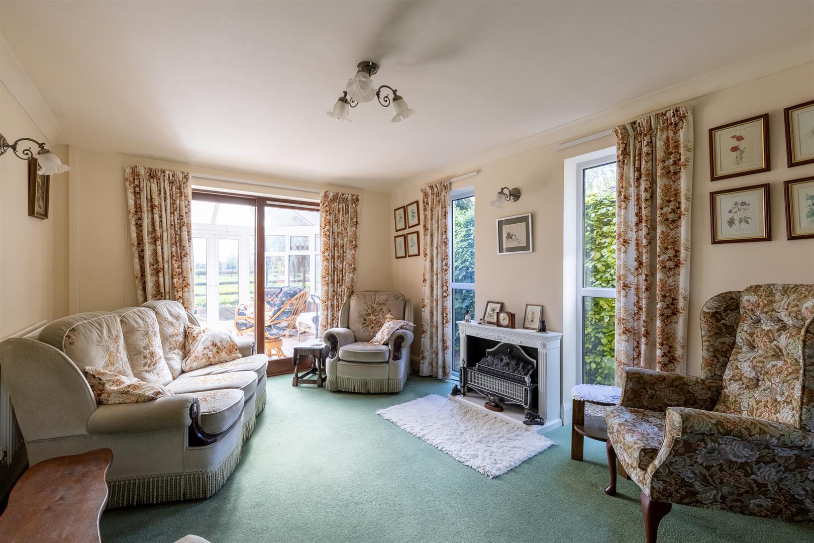 Dimensions: 7.80m x 3.61m (25'7" x 11'10"). Double glazed window to front and two double glazed picture windows to side, five single wall lights, sliding double glazed doors to conservatory, two radiators.