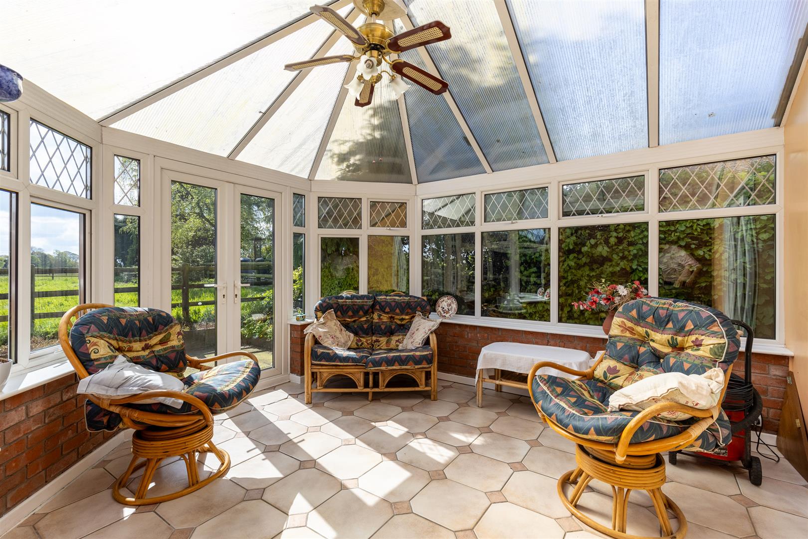 Dimensions: 3.73m x 3.73m (12'3" x 12'3"). Brick based, uPVC double glazed windows and door to garden, door to kitchen, fan/light, tiled floor.