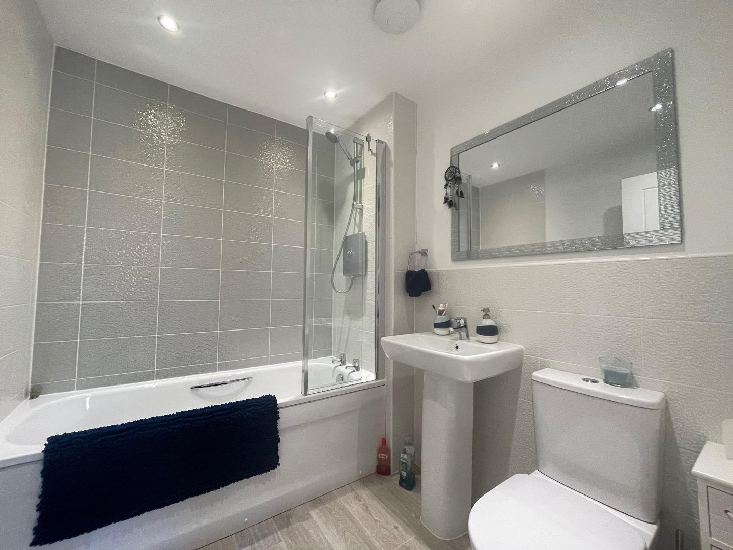 Modern suite comprising panel bath with electric shower over, close coupled WC, pedestal wash hand basin.