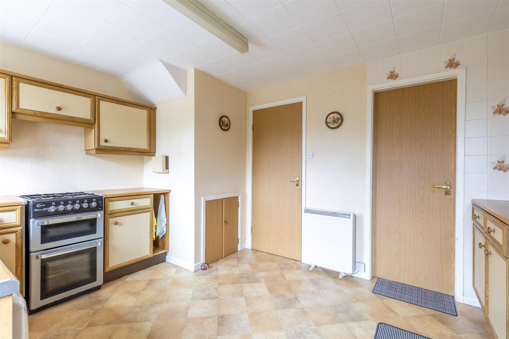 Dimensions: 4.06m x 3.15m (13'4" x 10'4"). 'L' shaped, fitted units to three elevations, stainless steel sink unit, gas slot cooker space, base and wall mounted cupboards, two uPVC double glazed windows, Creda storage heater, understairs storage cupboard, uPVC double glazed exterior door. Plumbing for washing machine.