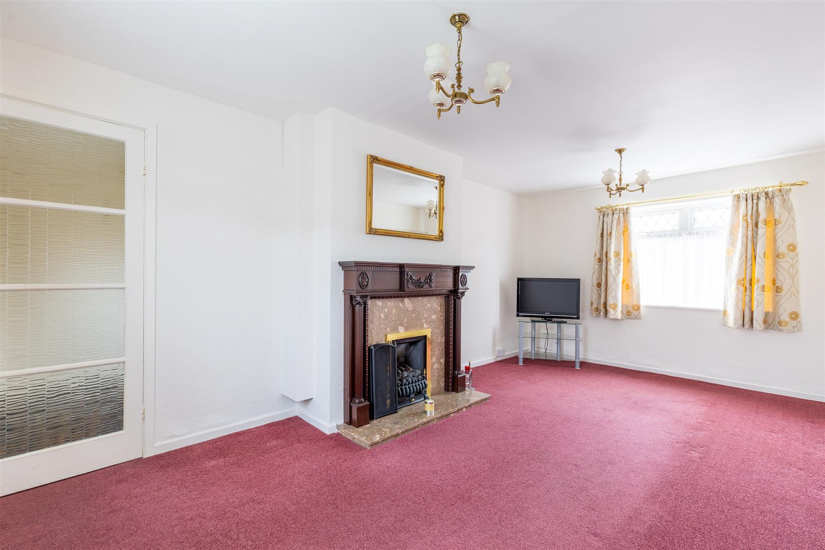 Dimensions: 5.44m x 3.23m (17'10" x 10'7"). Ornate Adam style with marble effect back and hearth. Living flame coal effect gas fire, two uPVC double glazed windows, two wall light points.