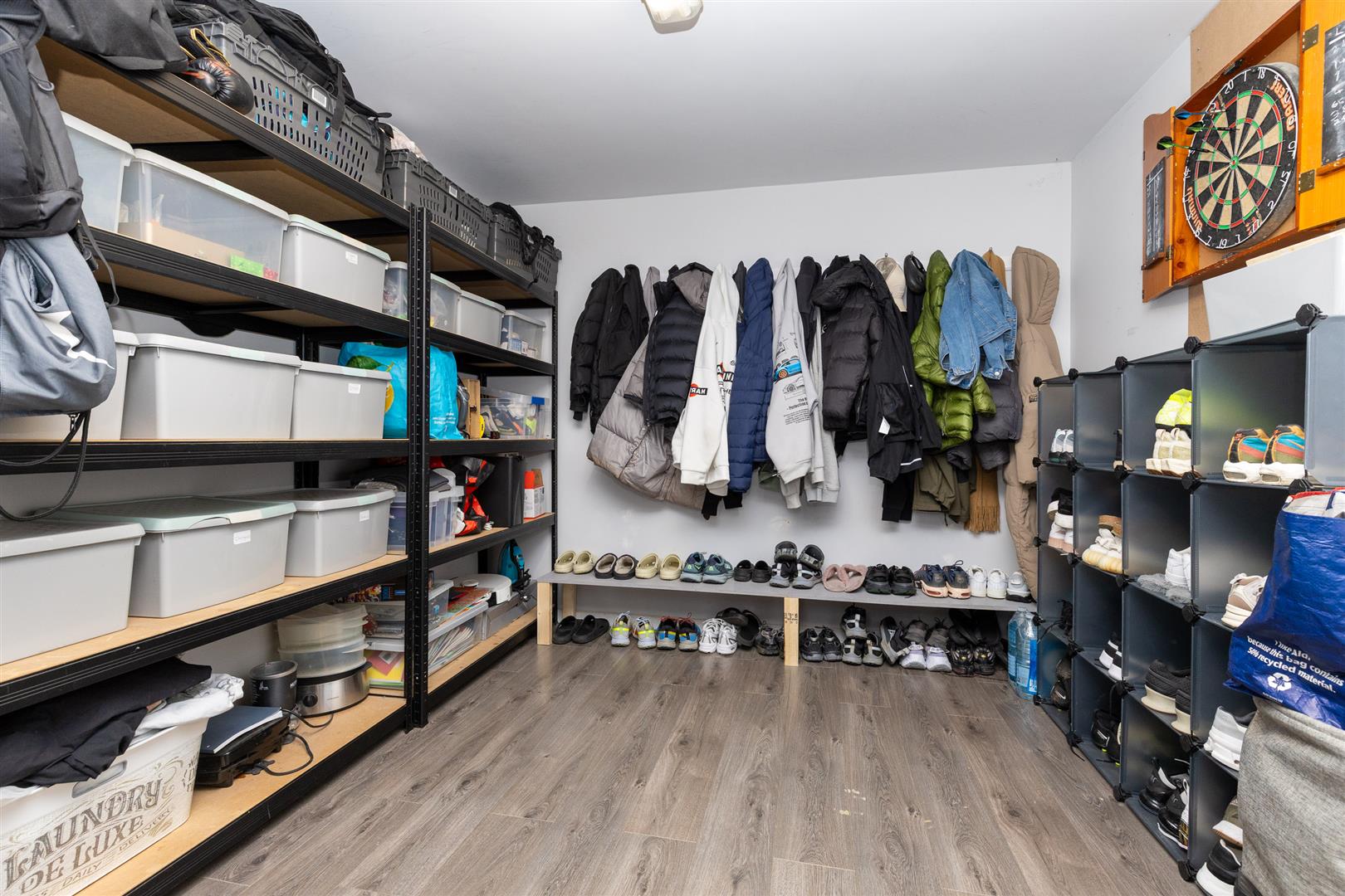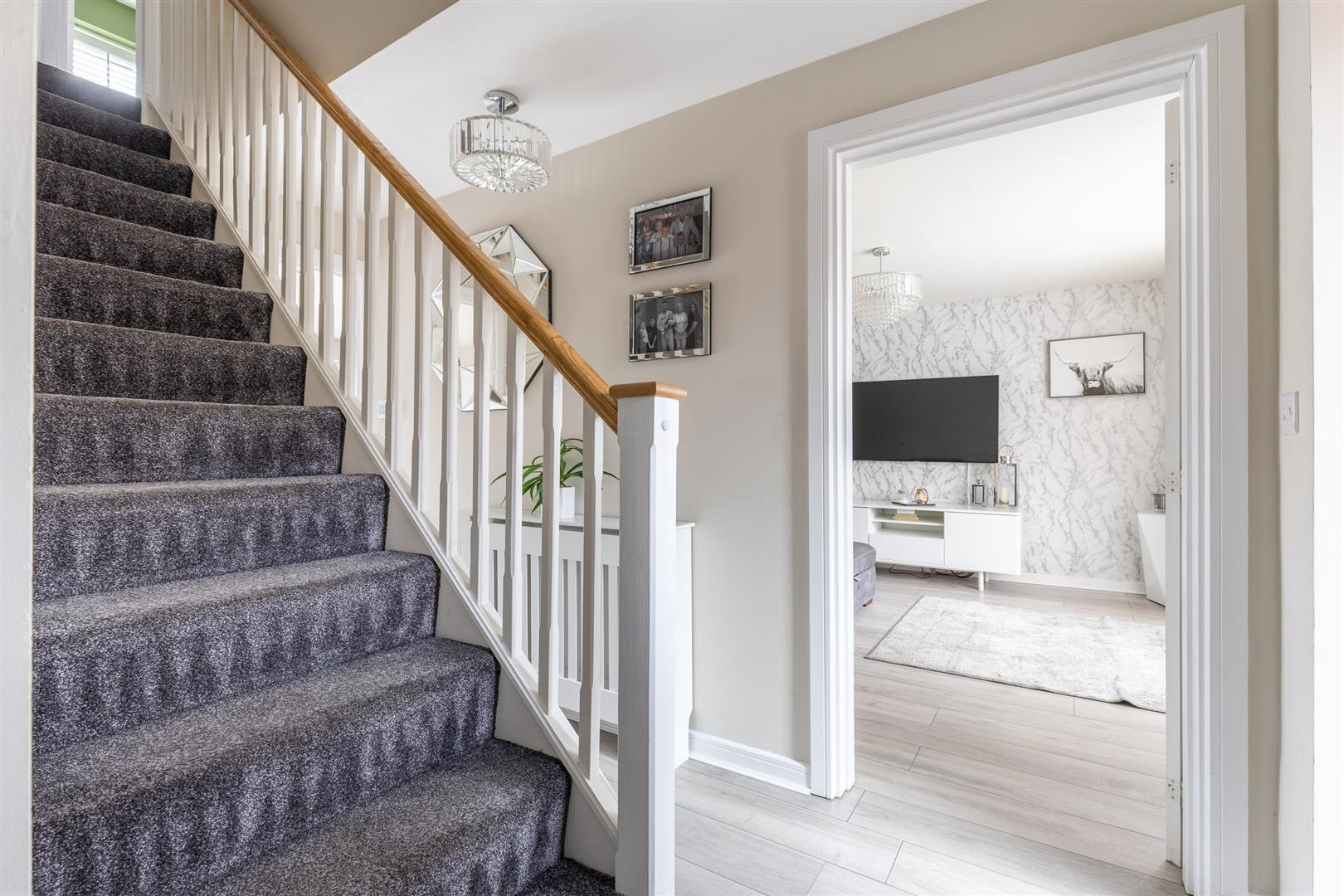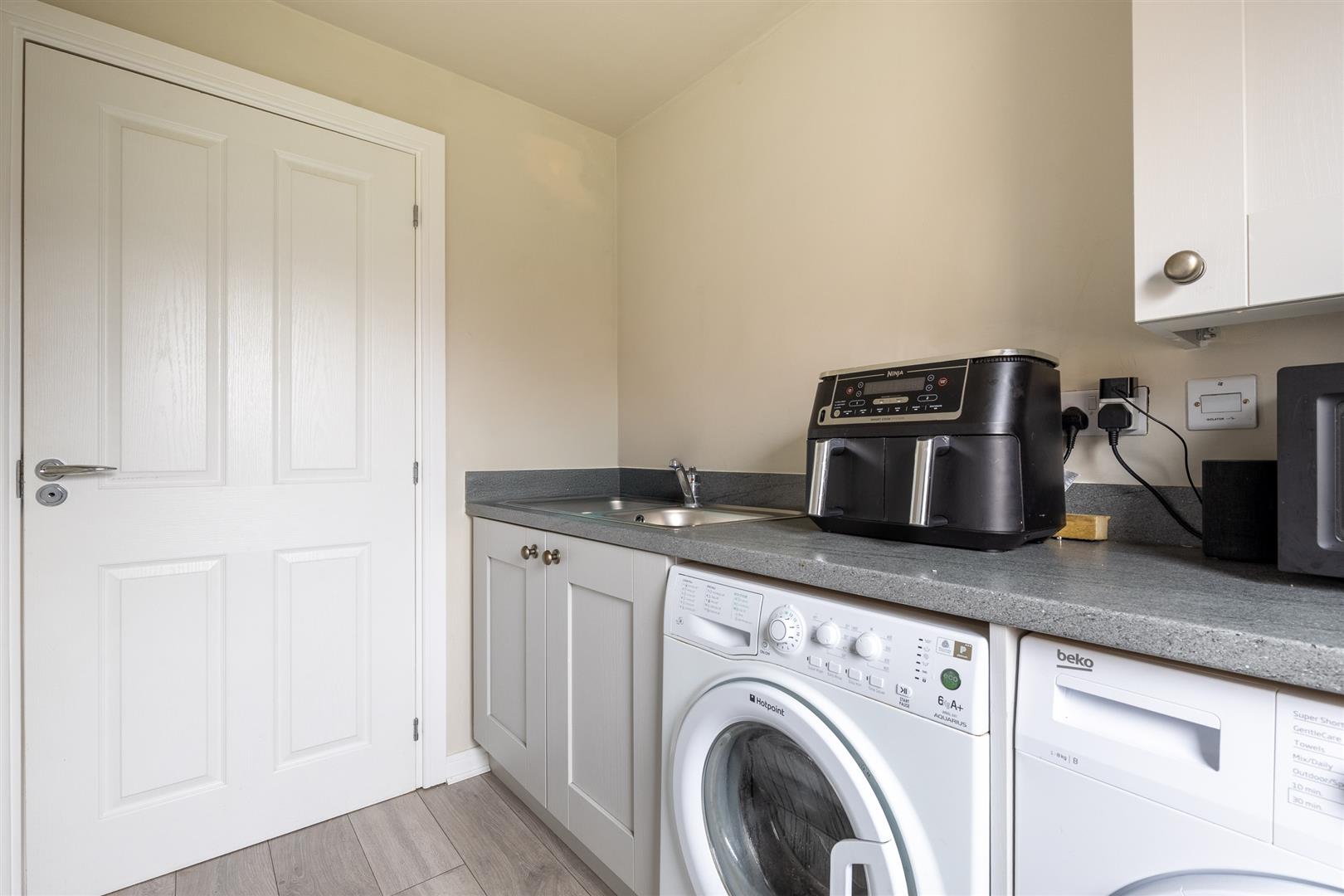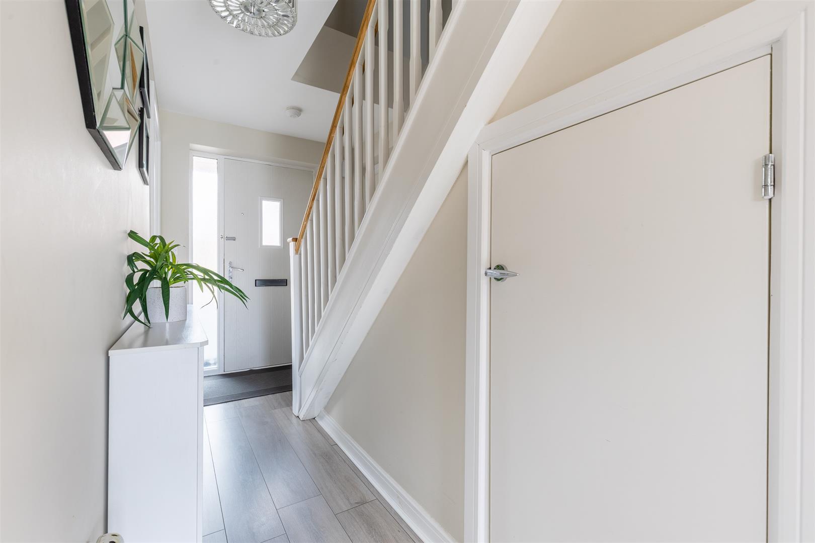 You’re welcomed into the home through a stylish front door featuring frosted sidelights and a frosted glass panel, leading into a bright entrance hall with access to understairs storage. The main living room is generously proportioned and features a large bay window that fills the space with natural light. To the rear of the property, the open-plan kitchen/dining room is well equipped with matching wall and base units under a sleek grey worktop, a 1½ bowl sink, and integrated appliances including a dishwasher, fridge freezer, four-ring gas hob, and oven. A window and patio doors overlook and open onto the rear garden. Adjoining the kitchen is a practical utility room fitted with coordinating cabinetry, a sink, plumbing for a washer/dryer, and housing for the boiler. The utility also provides access to the cloakroom. The converted garage has been transformed into a versatile second reception room or boot room, adding valuable living or storage space. Each room on the ground floor is finished with wood-effect laminate flooring, light fittings, double-glazed windows, and radiators.