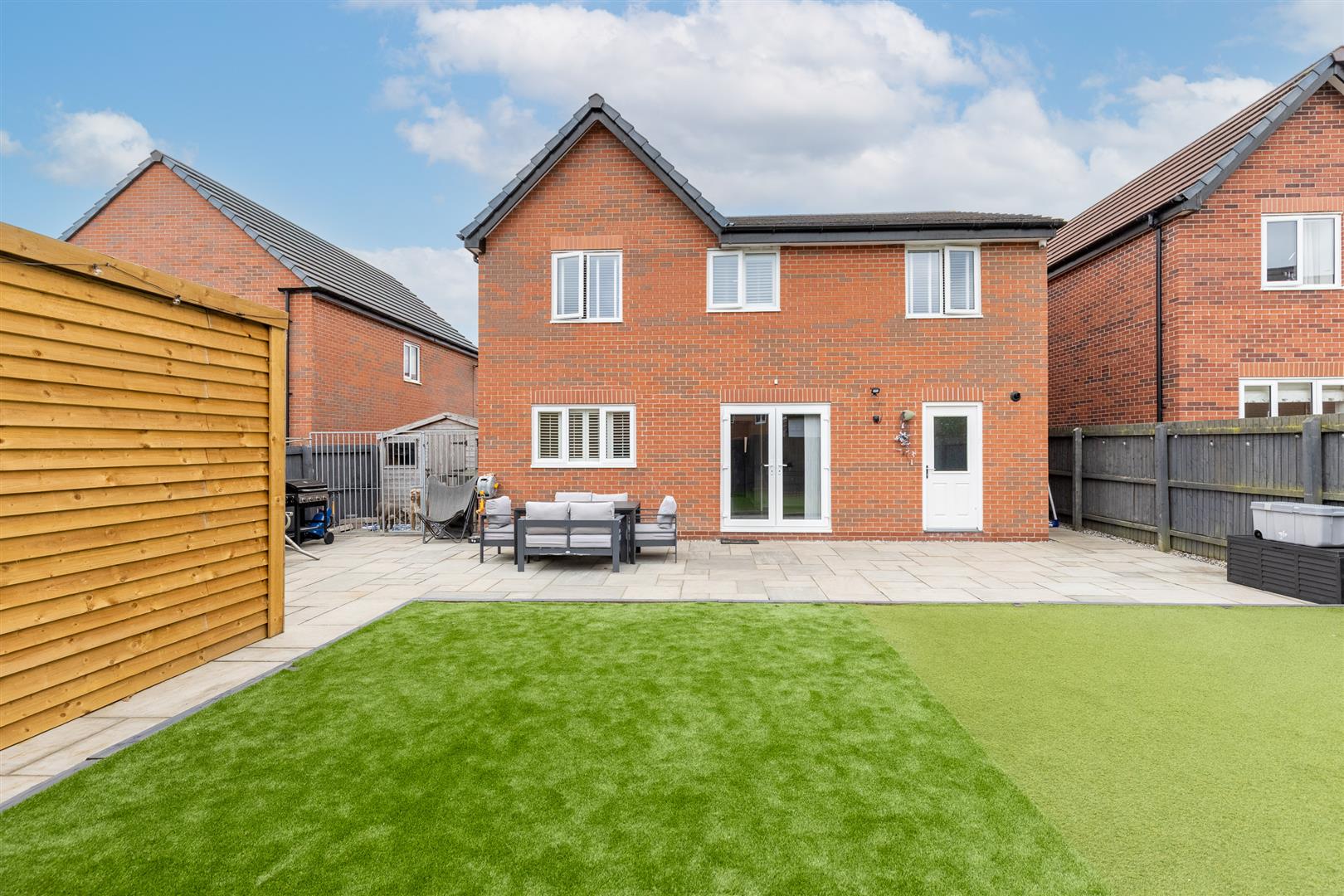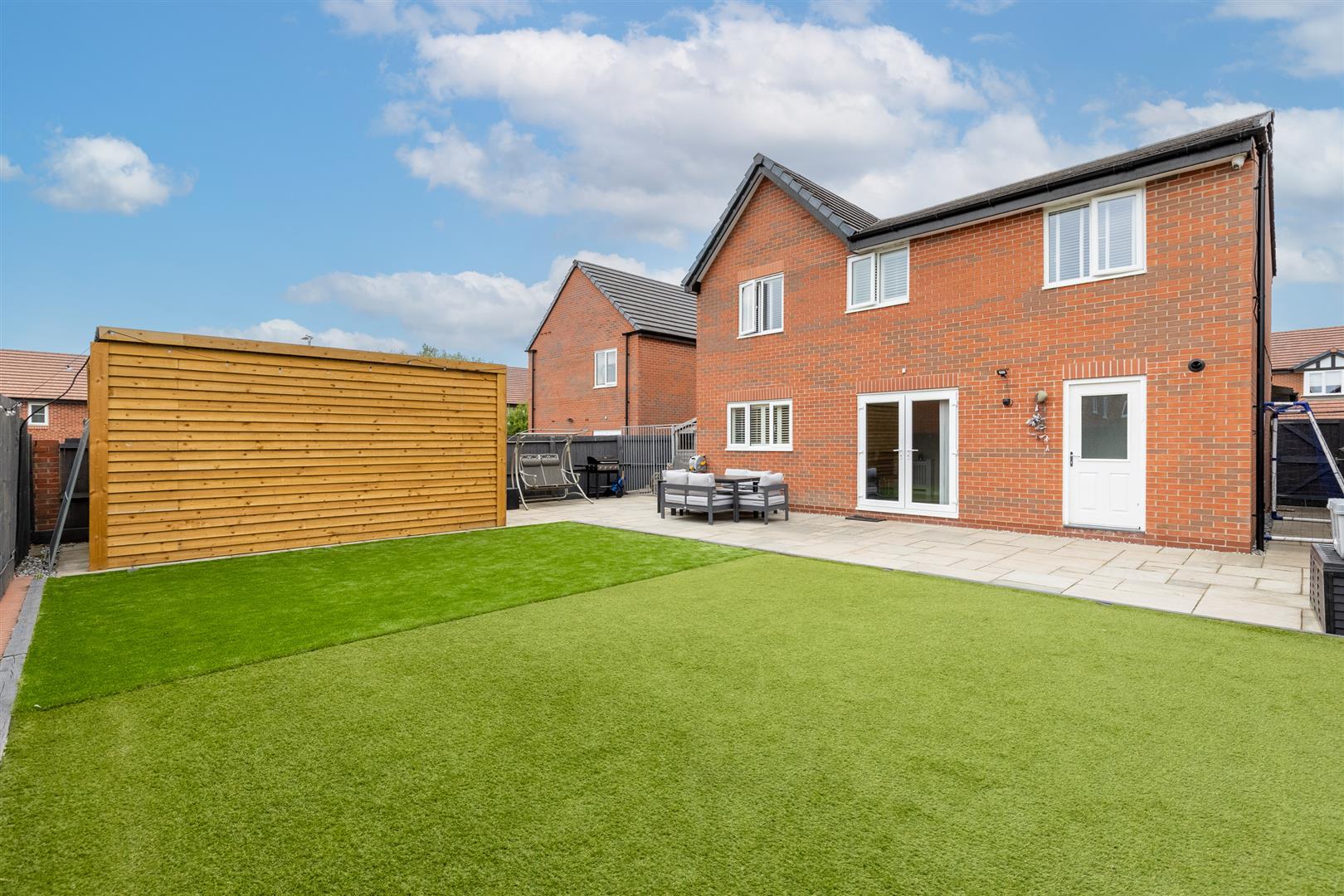 To the rear, the property boasts a generous garden comprising a large paved patio area and an astroturf lawn, offering a low-maintenance yet inviting outdoor space. A paved path surrounds the house and provides side access to the front. A standout feature is the large garden shed, which is fully equipped with power and lighting — perfect for use as a workshop or garden studio.