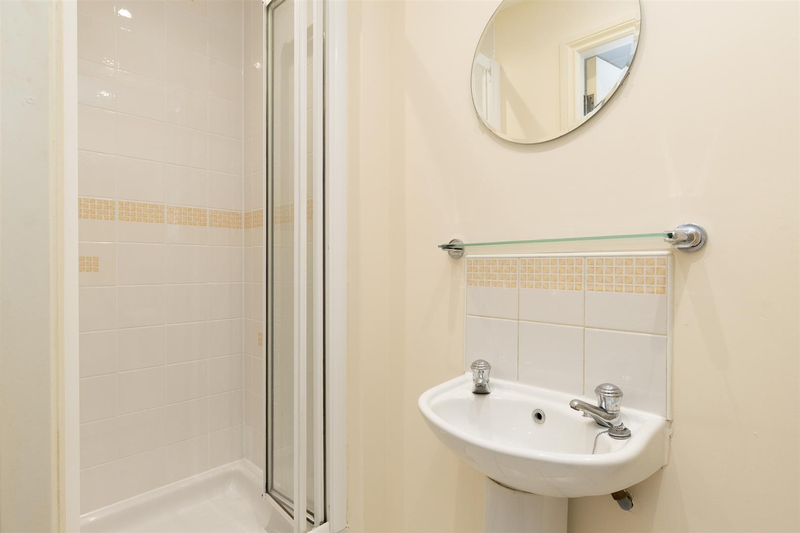 The ground floor provides a flexible and practical living space. Off the entrance hall is a versatile room which could be used as a bedroom or a home office. A modern shower room with a walk-in shower, pedestal sink, and low flush W/C serves this level, while a utility room to the rear offers plumbing for a washing machine and provides direct access to the garden.