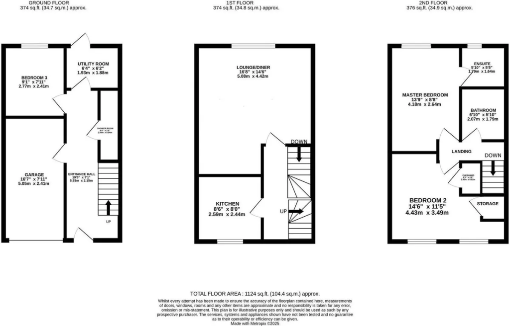 The top floor houses two well-sized double bedrooms. The master bedroom includes an en-suite shower room, while the second bedroom benefits from two built-in storage cupboards. A family bathroom with a panelled bath, pedestal sink, and low flush W/C completes the upstairs accommodation.