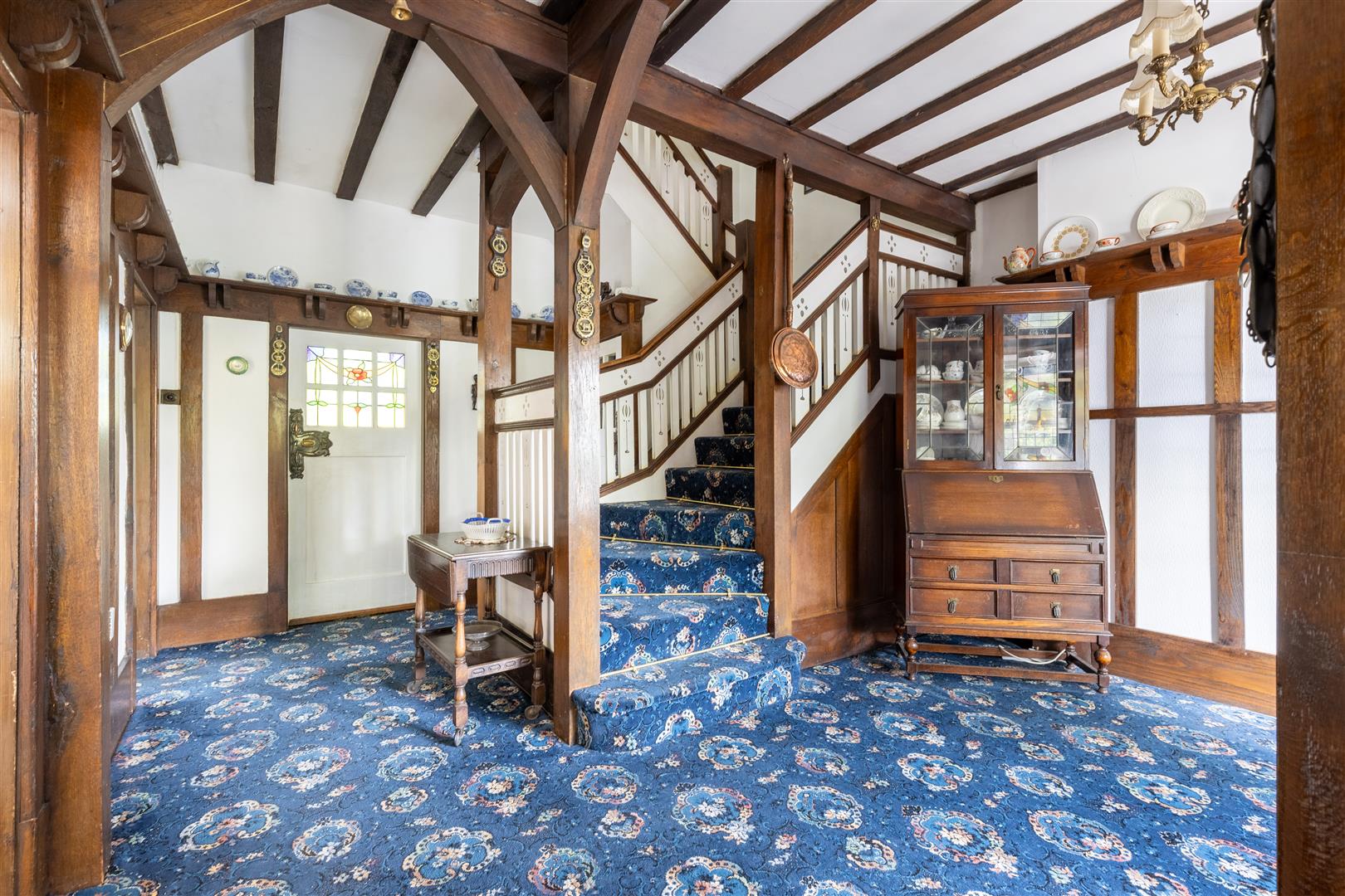Dimensions: 5.56m plus bay x 4.32m (18'3" plus bay x 14'2"). Leaded light, stained glass bay window, ceiling beams, wall timbers, plate rack, entrance door with stained glass top lights, walk in cloaks store with hanging fitting and shelving, two radiators.