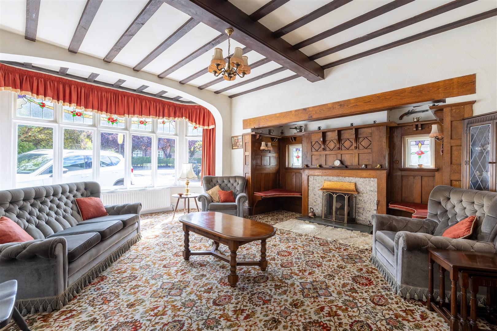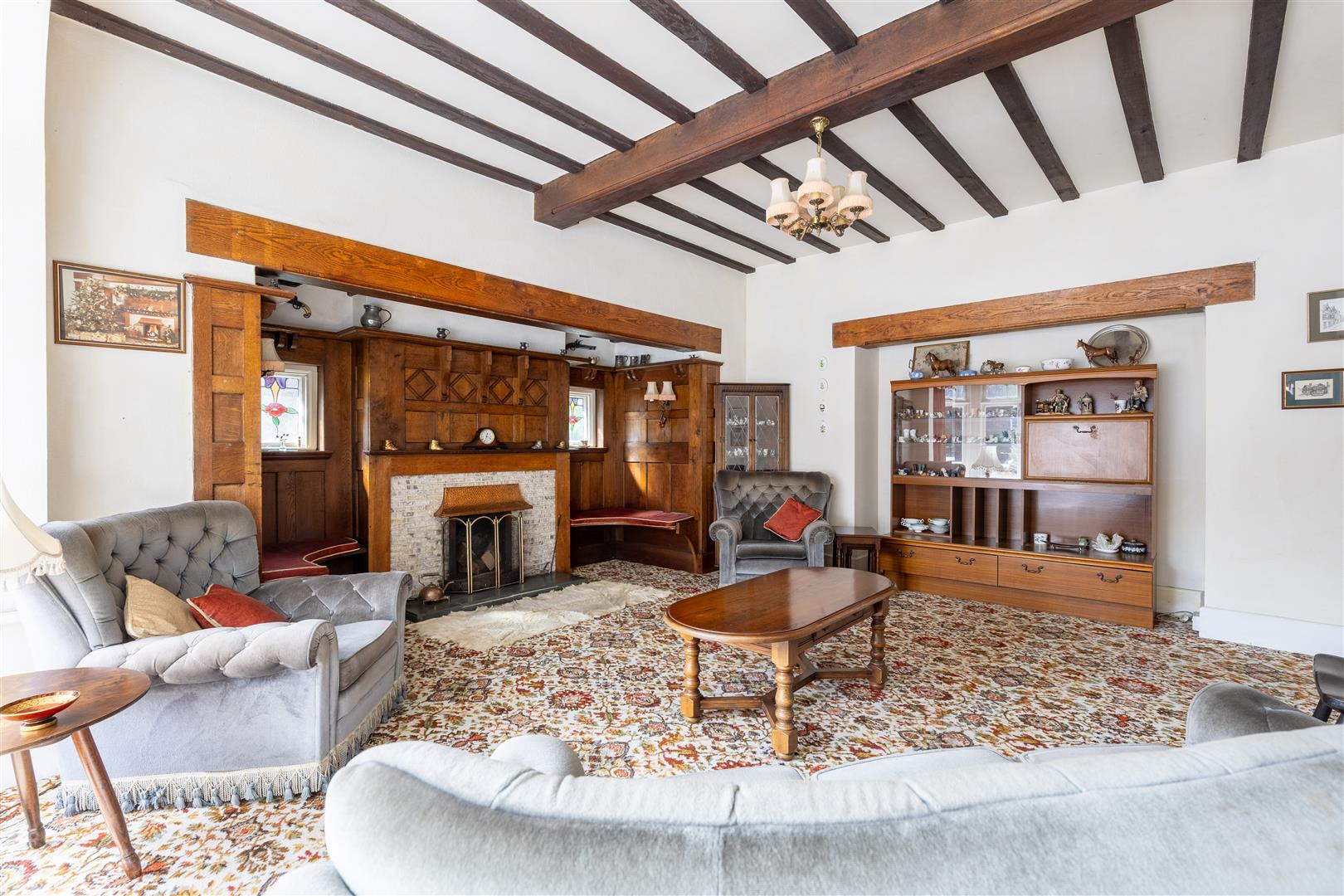Dimensions: 6.12m x 5.44m (20'1" x 17'10"). Inglenook with stone fireplace, slate hearth, timber surround and mantle, panelled walls seating and two stained glass windows, bay window with stained glass top lights, beamed ceiling, two radiators.