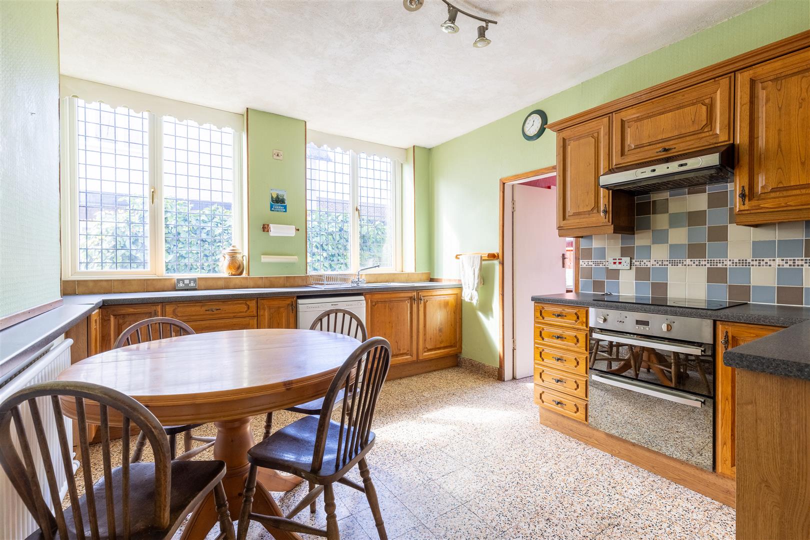 Dimensions: 4.32m x 3.63m (14'2" x 11'11"). Stainless steel one and half bowl single drainer sink unit, cupboard under, floor standing cupboard and drawer units with worktops, wine rack, wall cupboards, integrated oven/grill and four burner ceramic hob unit with extractor hood above, Hotpoint dishwasher, terrazzo tiled floor, two uPVC leaded lights, double glazed windows, radiator.