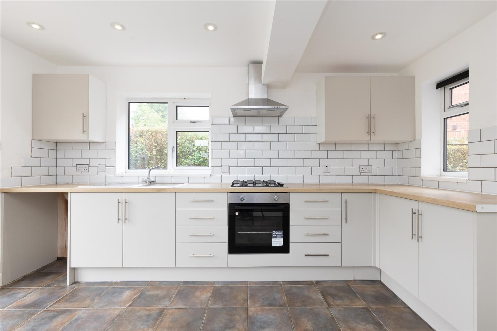 Dimensions: 4.17m x 3.25m (13'8" x 10'8" ). Re fitted in 2023, stainless steel single drainer sink unit, cupboards under, floor standing cupboard and drawer units with work tops, wall cupboard, integrated oven and four burner gas hob unit with extractor hood above, tiled floor, two double glazed windows and French windows to rear, radiator.