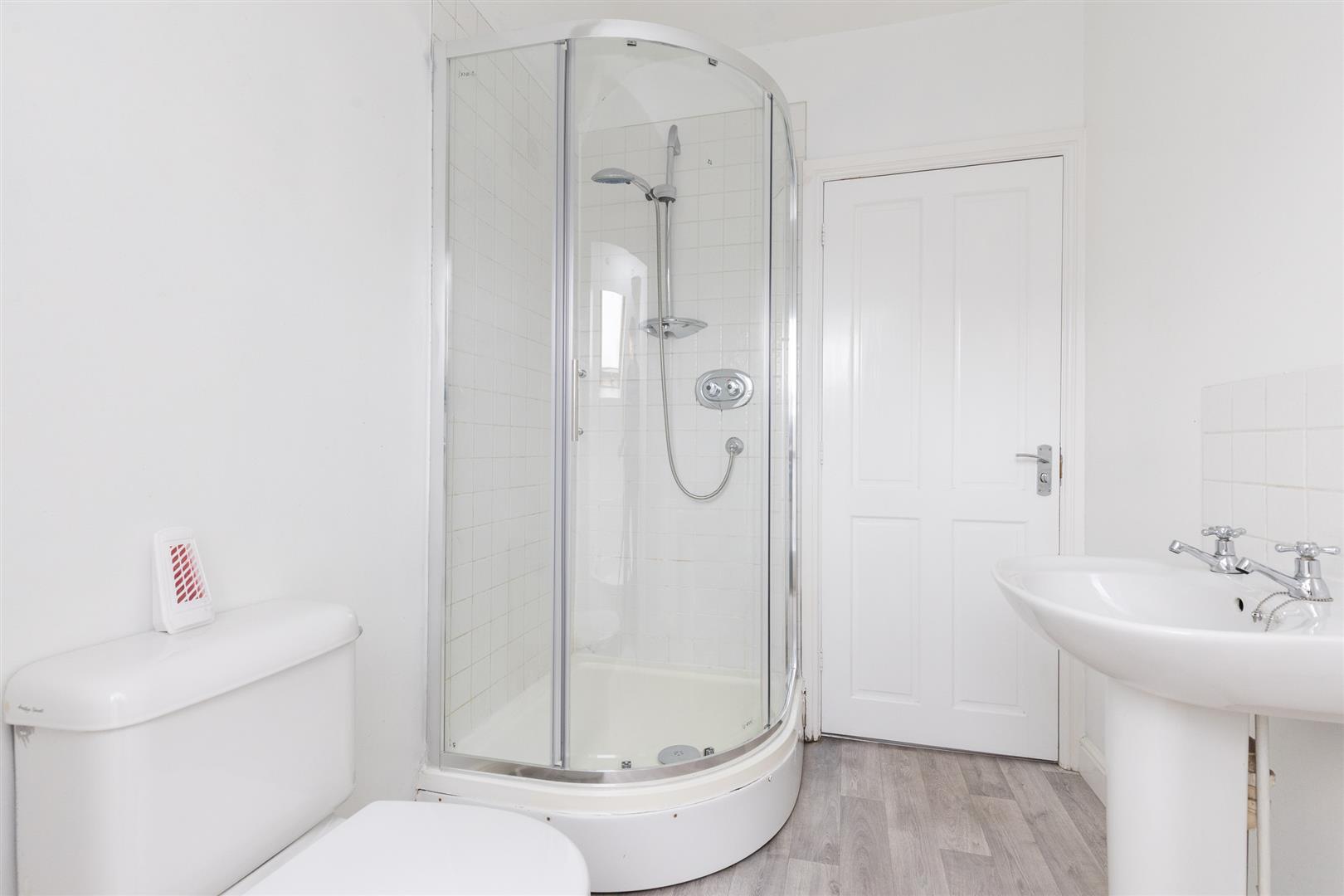 Dimensions: 3.68m x 1.75m (12'1" x 5'9" ). White suite comprising hand basin, low flush WC and sunken corner bath, tiled shower cubicle, with shower, shaver point, double glazed roof light, radiator.