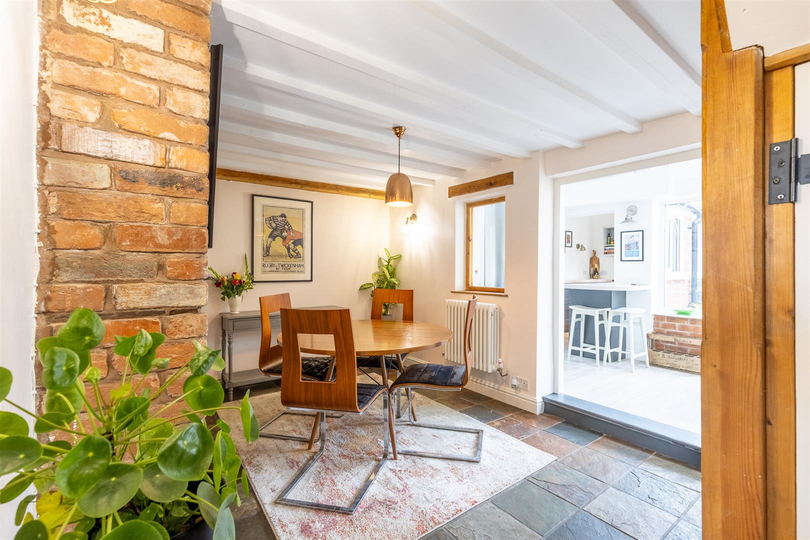 Dimensions: 4.57m x 2.82m (15'0" x 9'3"). Brick fireplace (not operational), stone floor, original entrance door, painted beamed ceiling, two single wall lights, under stairs store housing Worcester oil fired combination boiler, open to kitchen/garden room, period style radiator.