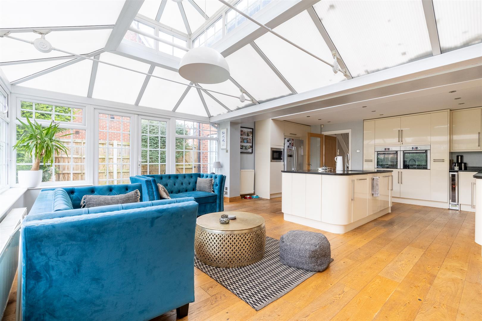 Dimensions: 7.72m x 5.13m (25'4" x 16'10"). Refitted in 2014 with a superb range of bespoke fitted units comprising floor standing cupboard and drawers with granite worktops, island unit/breakfast bar with granite worktop, wall cupboards, larder cupboard, tall floor standing cupboards, two integrated Bosch ovens and microwave, four burner hob unit with extractor hood above, integrated dishwasher, American style refrigerator/freezer, oak flooring, double glazed windows, French windows and lantern roof, two radiators, door to garage.
