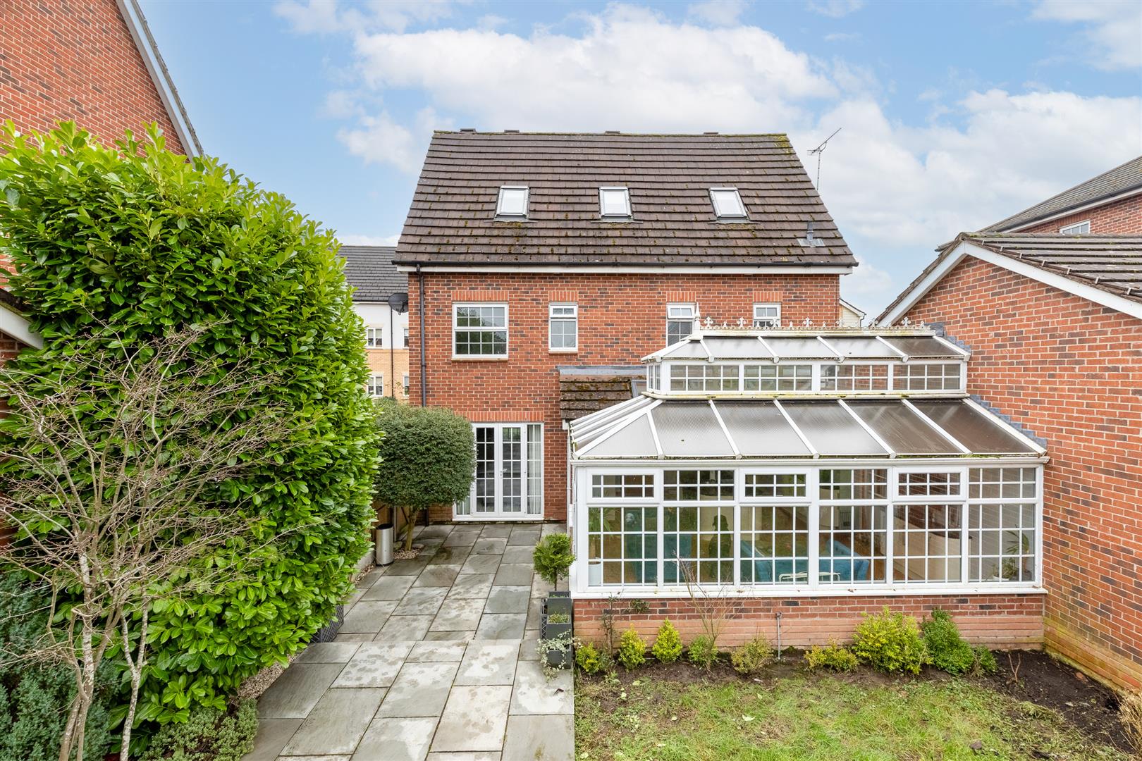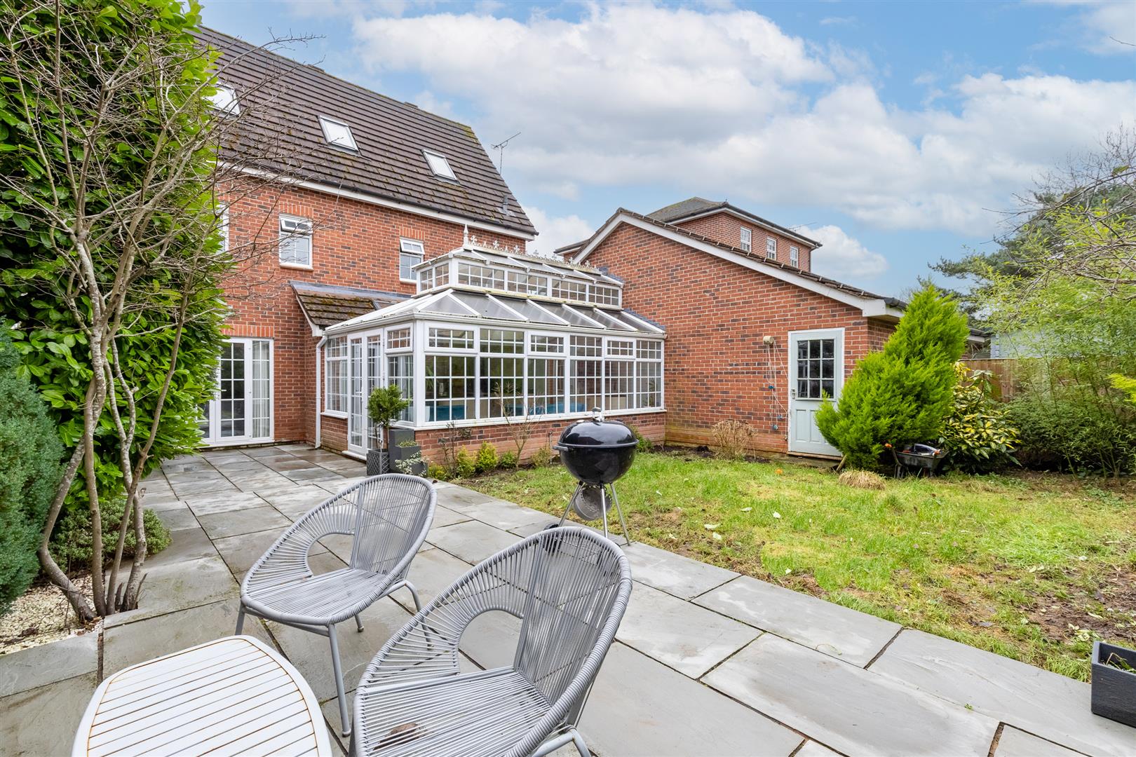 The rear garden is lawned with conifers, shrubs and a 45 foot flagged patio.