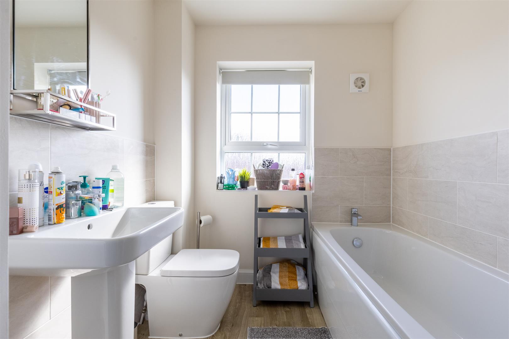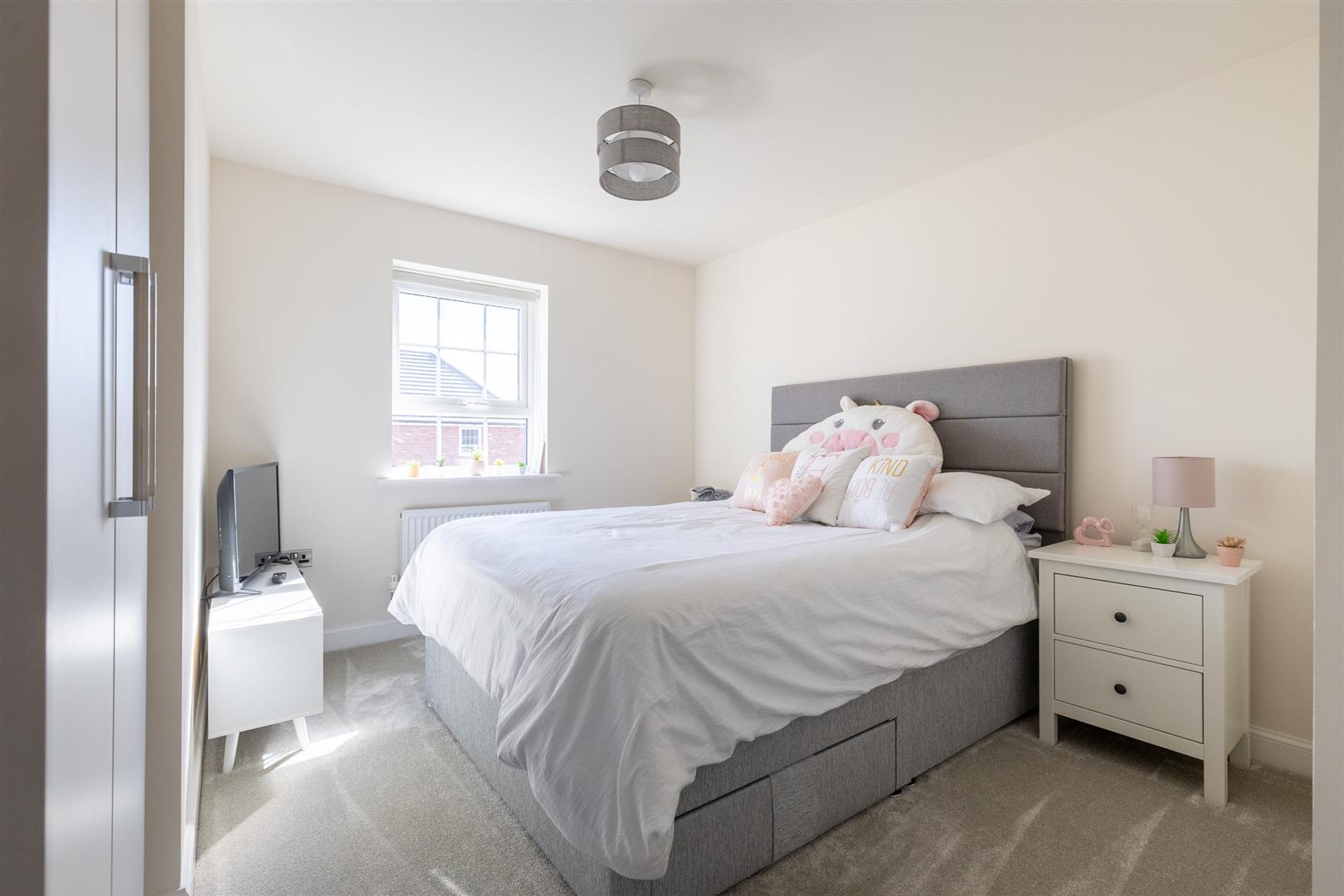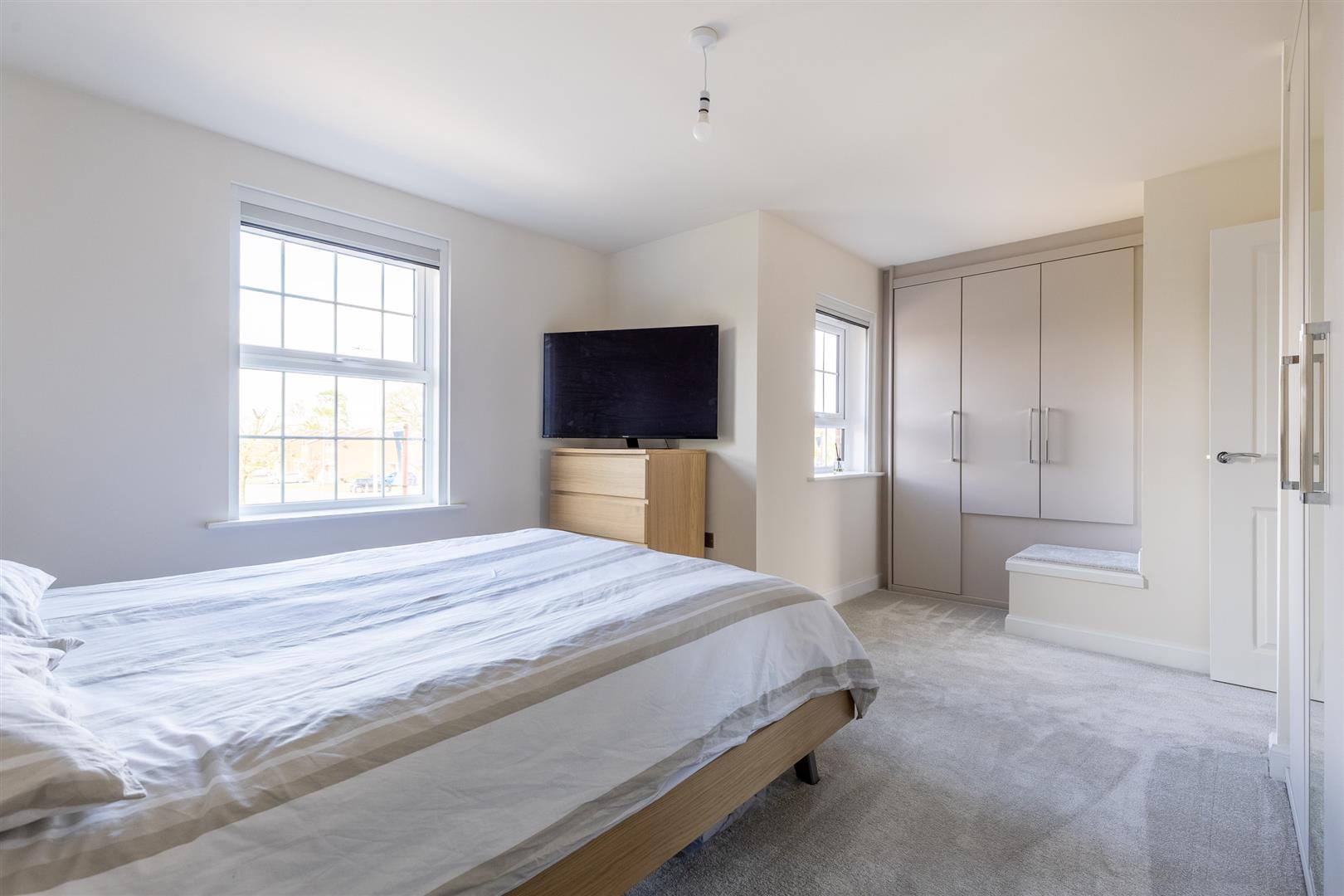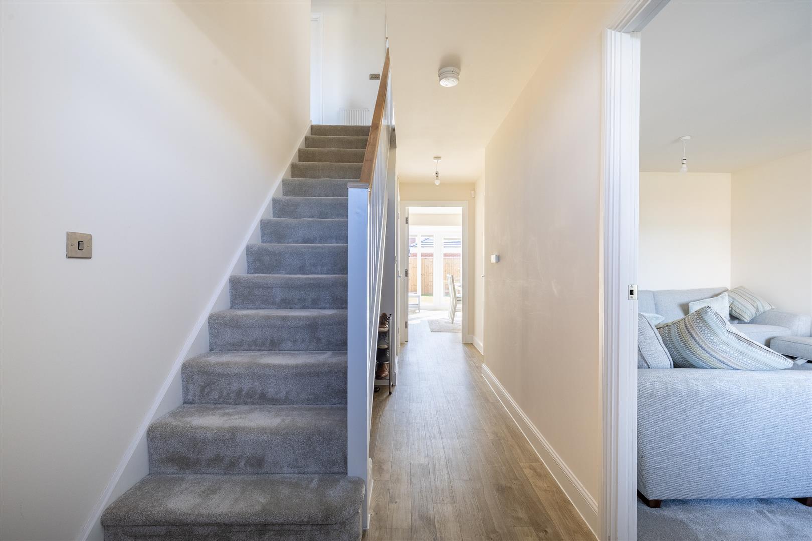 The property welcomes you with a spacious entrance hall providing access to a cloakroom and a useful storage cupboard. Off the hall, the generous living room features a large double-glazed bay window to the front, filling the space with natural light. The heart of the home is the kitchen/dinning room, where the current owner selected David Wilson’s upgraded Gold Standard kitchen package. This includes high-quality matching wall and base units and a full range of integrated appliances: induction hob, double oven, dishwasher, and fridge freezer. Double doors open out onto the east-facing garden, creating an ideal indoor-outdoor flow. A separate utility room offers additional storage, plumbing for a washer/dryer. The utility room also houses the boiler, and provides convenient access to the garden via a rear door. Throughout the ground floor, you’ll find Amtico flooring in all areas except the carpeted living room. Each room is completed with light fittings and radiators.