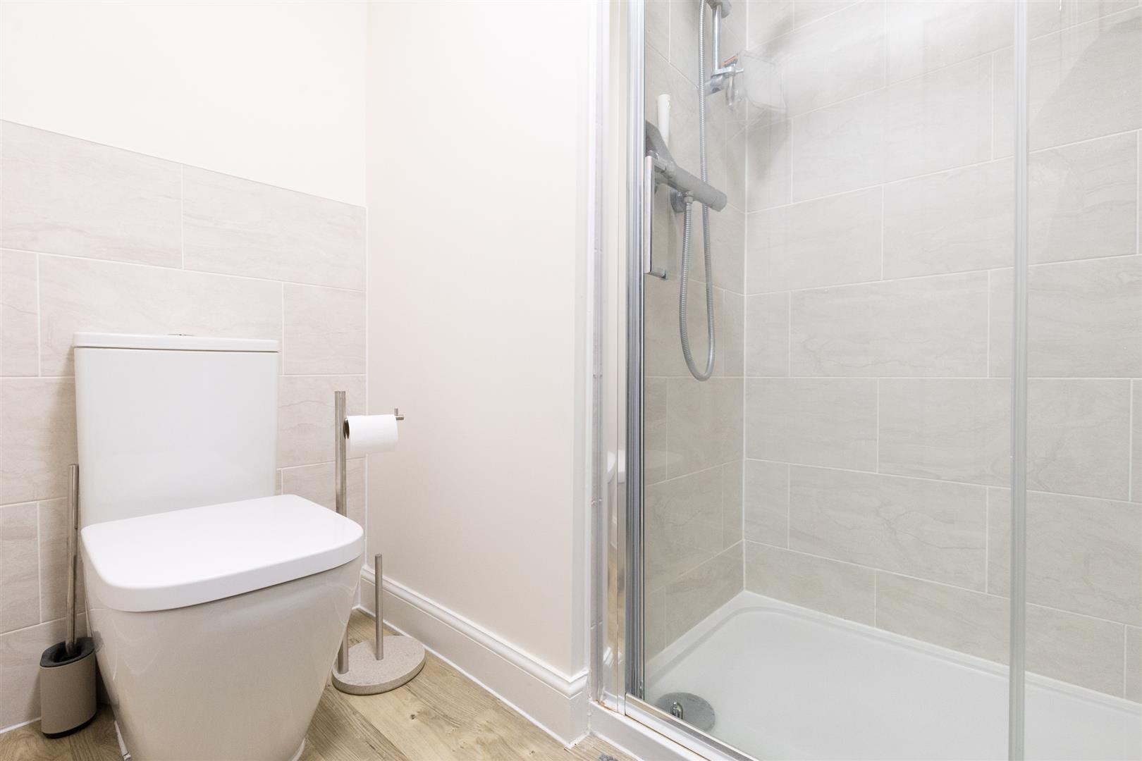 Upstairs, the property offers four well-proportioned bedrooms. The principal bedroom benefits from a private en-suite shower room. Three of the Four bedrooms include built-in wardrobes for ample storage. All bedrooms are finished with carpets, radiators, and light fittings. The family bathroom features a four piece suite which comprises of a panelled bath, separate glass-enclosed shower, pedestal sink, and low flush W/C. The room is completed with Amtico flooring, a heated towel rail, half-tiled walls, and a frosted double-glazed window.