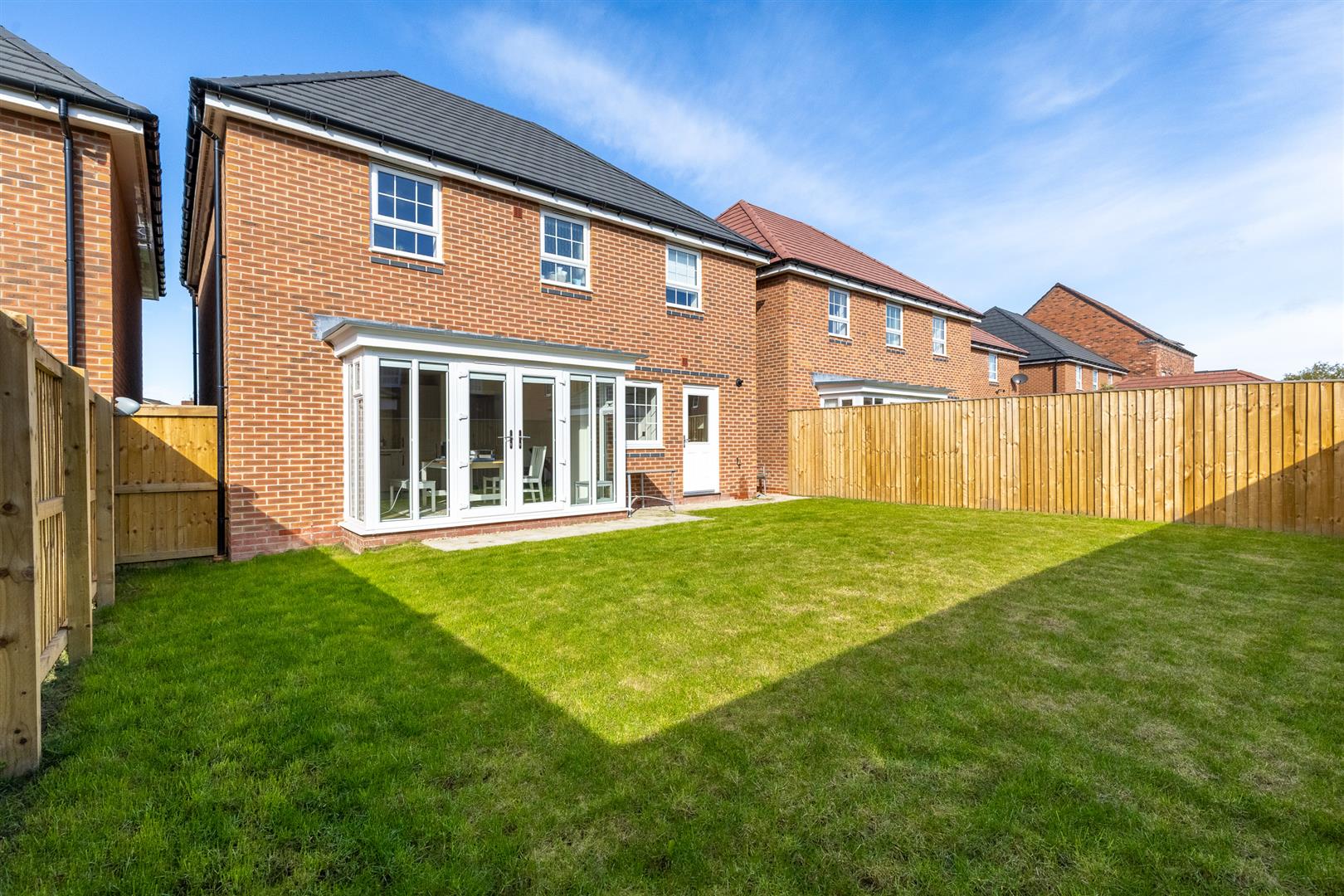 The east-facing rear garden is fully enclosed with 6ft fencing. It features a spacious lawn and a paved path that wraps around the side of the property, where a gate provides direct access to the front.