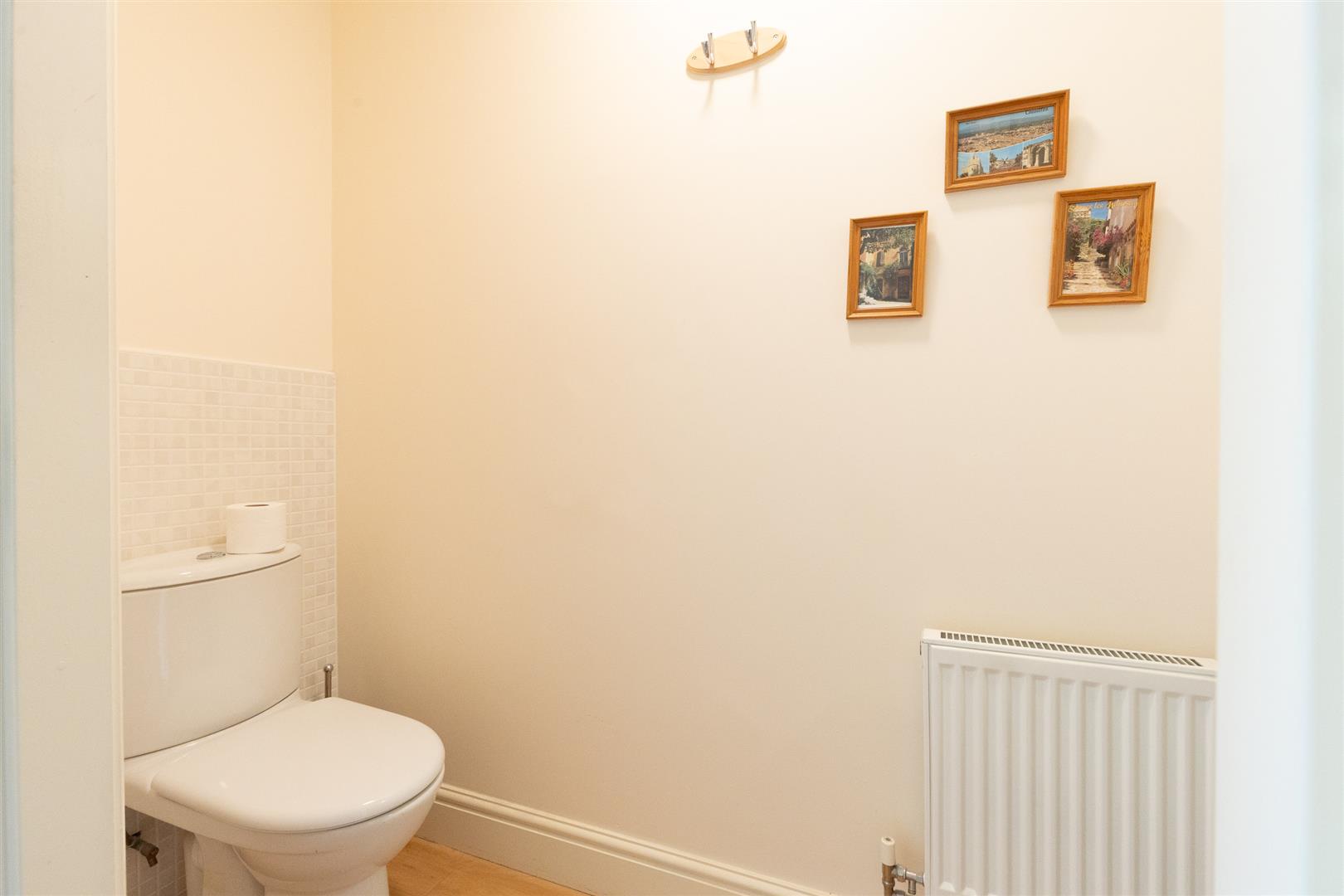 White suite comprising low flush W/C and hand basin, Karndean flooring, radiator.