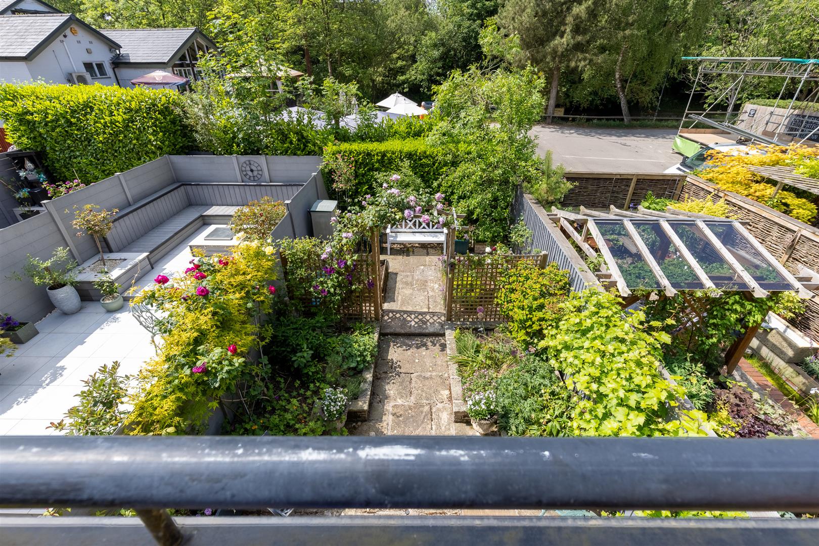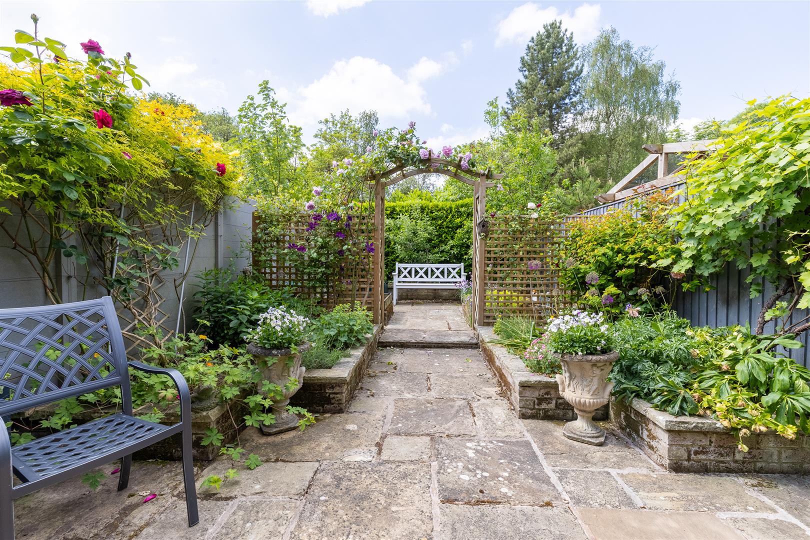 The rear garden has been designed for ease of management and is flagged (part Yorkstone) with raised borders, arch with climbing rose and a seating area.