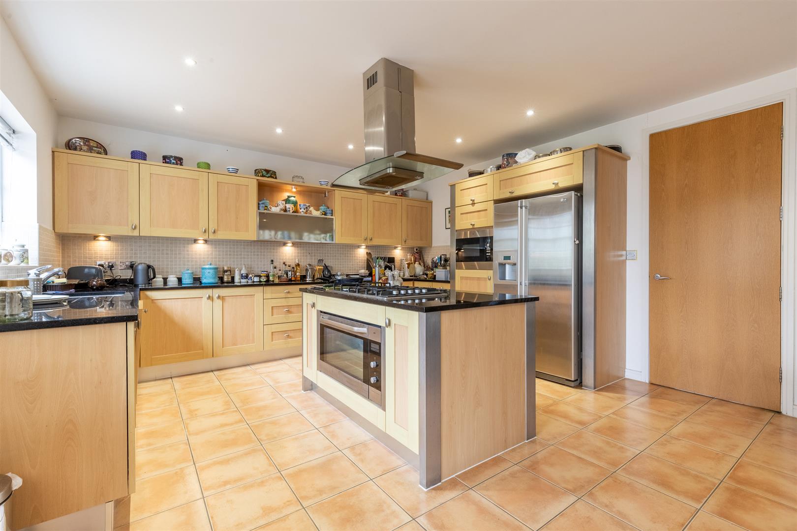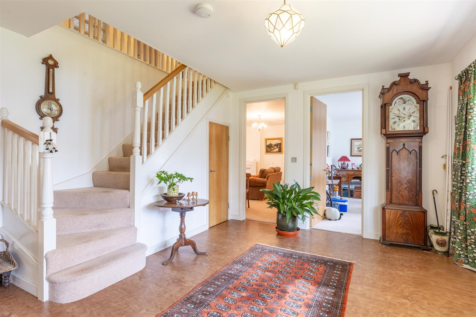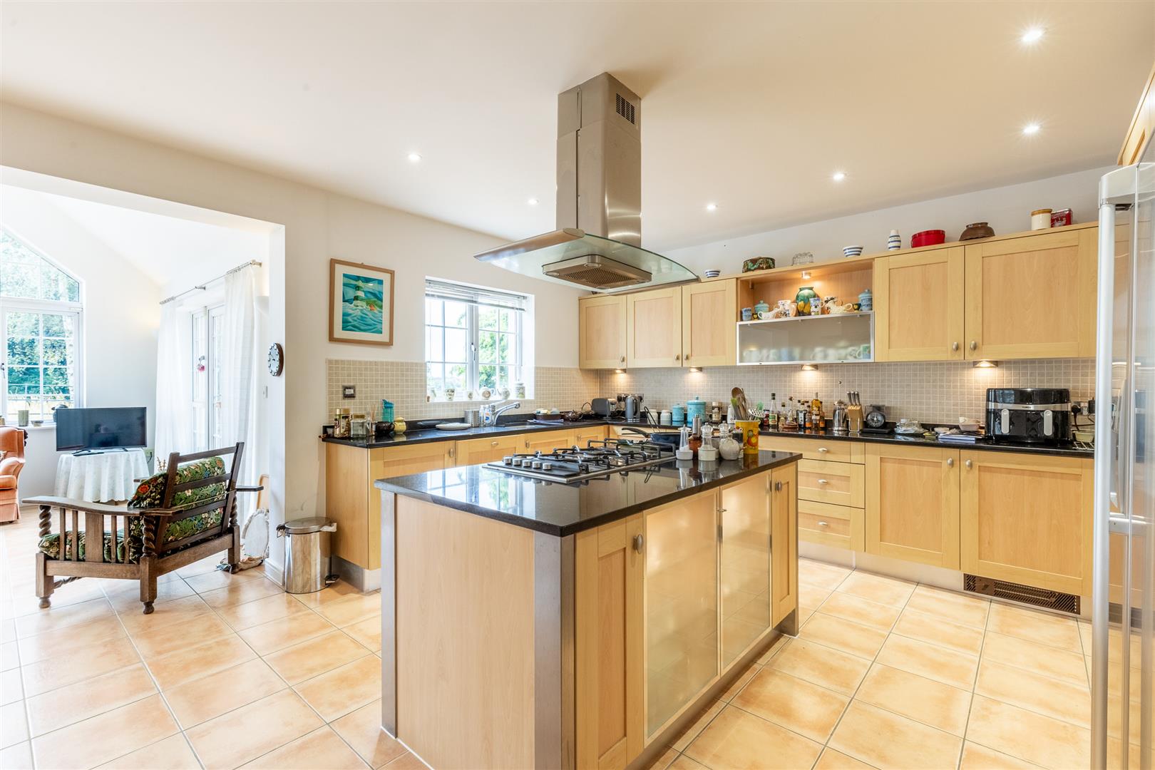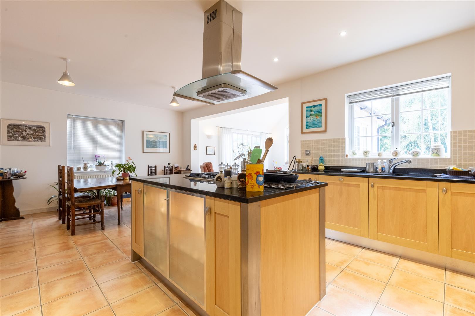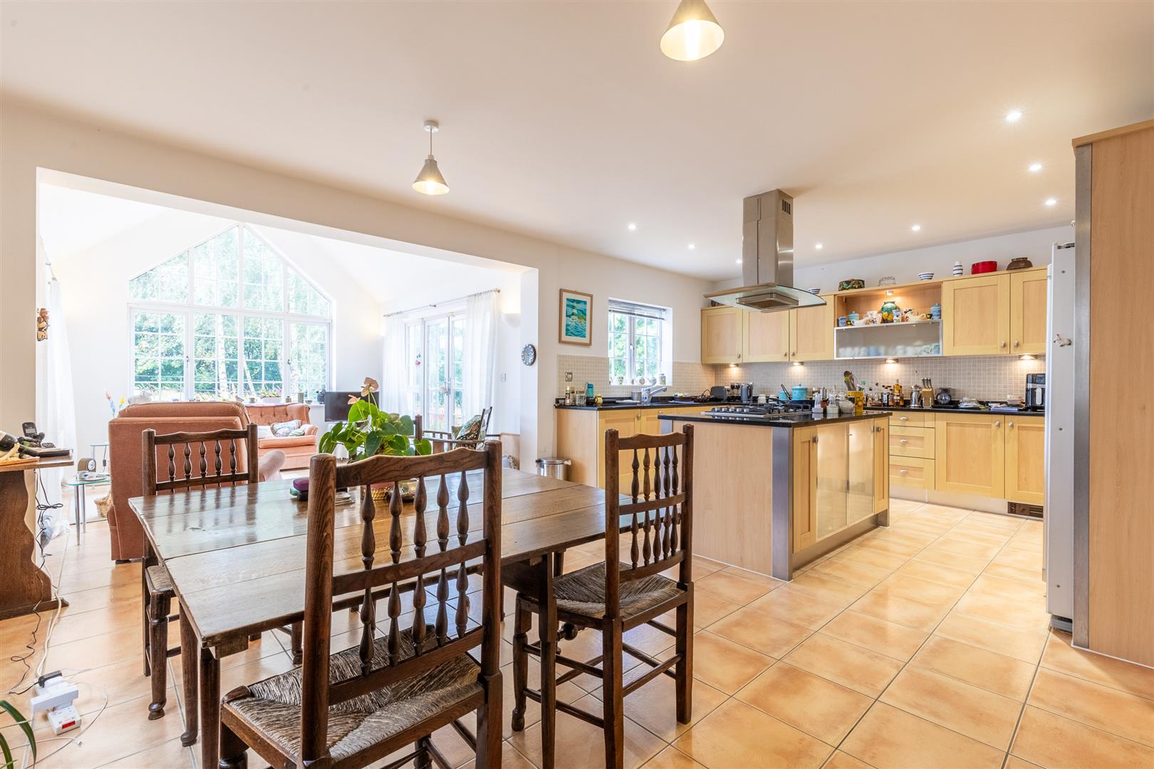 The property is accessed via a UPVC front door with glazed panel and double glazed windows to either side. The entrance hall features wooden flooring, a pendant light, radiator, and access to understairs storage and a cloakroom. The living room has carpeted flooring, two pendant lights, a fireplace with stone hearth and surround, two radiators, and double glazed patio doors with side windows opening to the rear garden. To the front of the property, the dining room includes a large double glazed bay window, spot lighting, carpeted flooring, and a radiator. The cloakroom comprises a low flush W/C, hand basin, half tiled walls, frosted double glazed window to the front, radiator, light fitting, and wooden flooring. At the rear, the open plan kitchen, dining and living space includes a fully fitted kitchen with matching wall and base units beneath granite worktops and a central island incorporating an AEG oven, five-ring hob and extractor. Additional integrated appliances include an AEG microwave and dishwasher, with a 1½ bowl sink and under-cabinet lighting. The kitchen area has tiled flooring, half tiled walls, spot lights, and a double glazed window to the rear. The dining area also features tiled flooring, two pendant lights, a radiator, and a double glazed window to the side. The living space benefits from tiled flooring, four wall lights, a radiator, side aspect double glazed window, full-height gable-end window, and rear patio doors with side windows providing access to the garden. A utility room leads off the kitchen and includes wall and base units, a sink, plumbing for a washing machine, half tiled walls, light fitting, and a UPVC side access door.