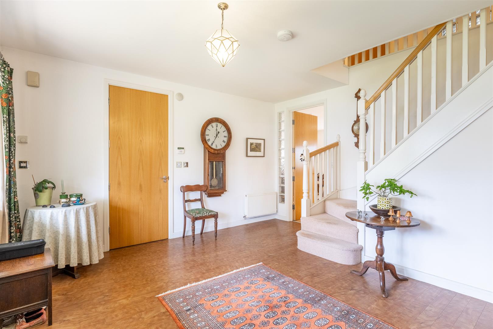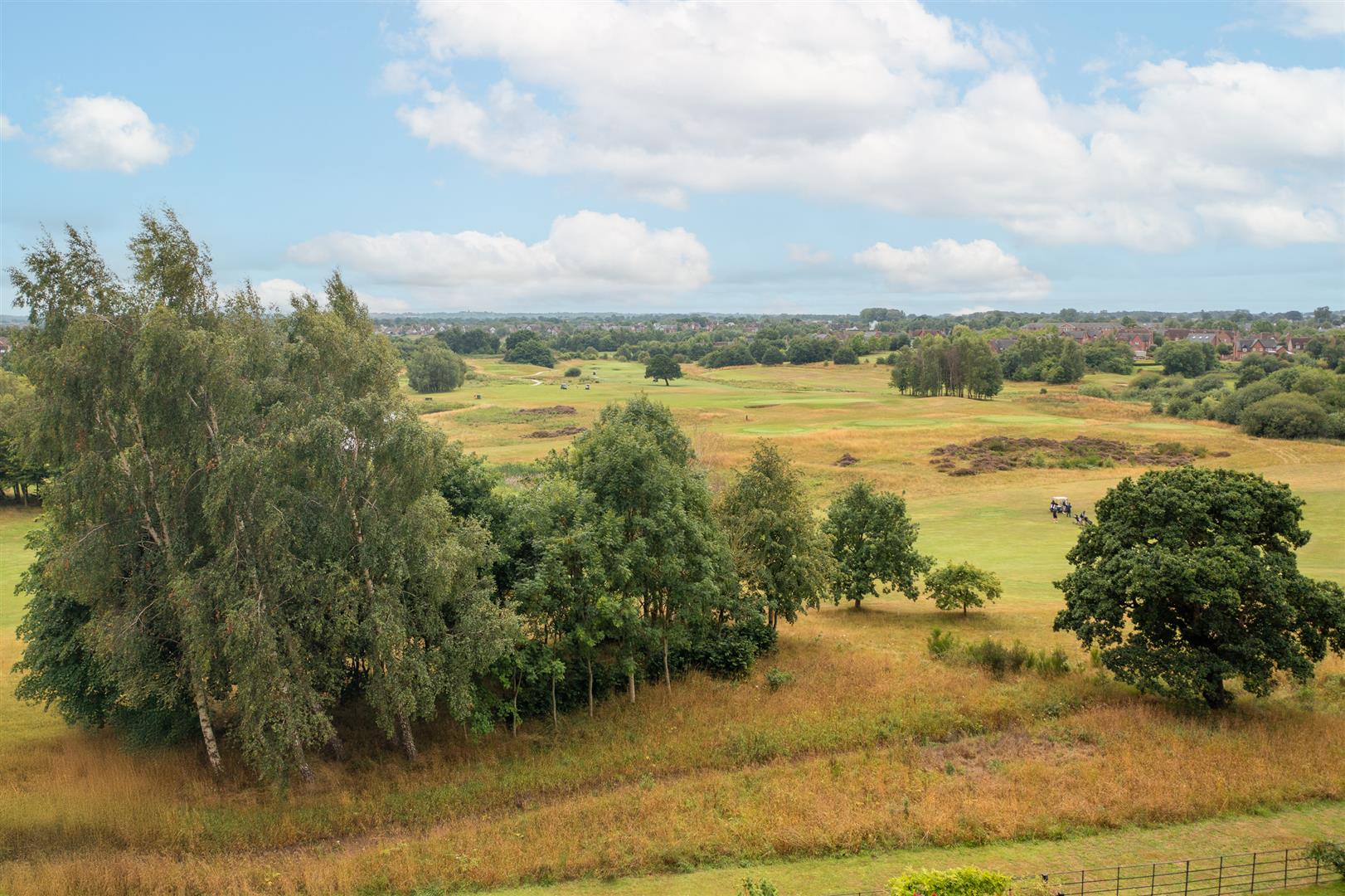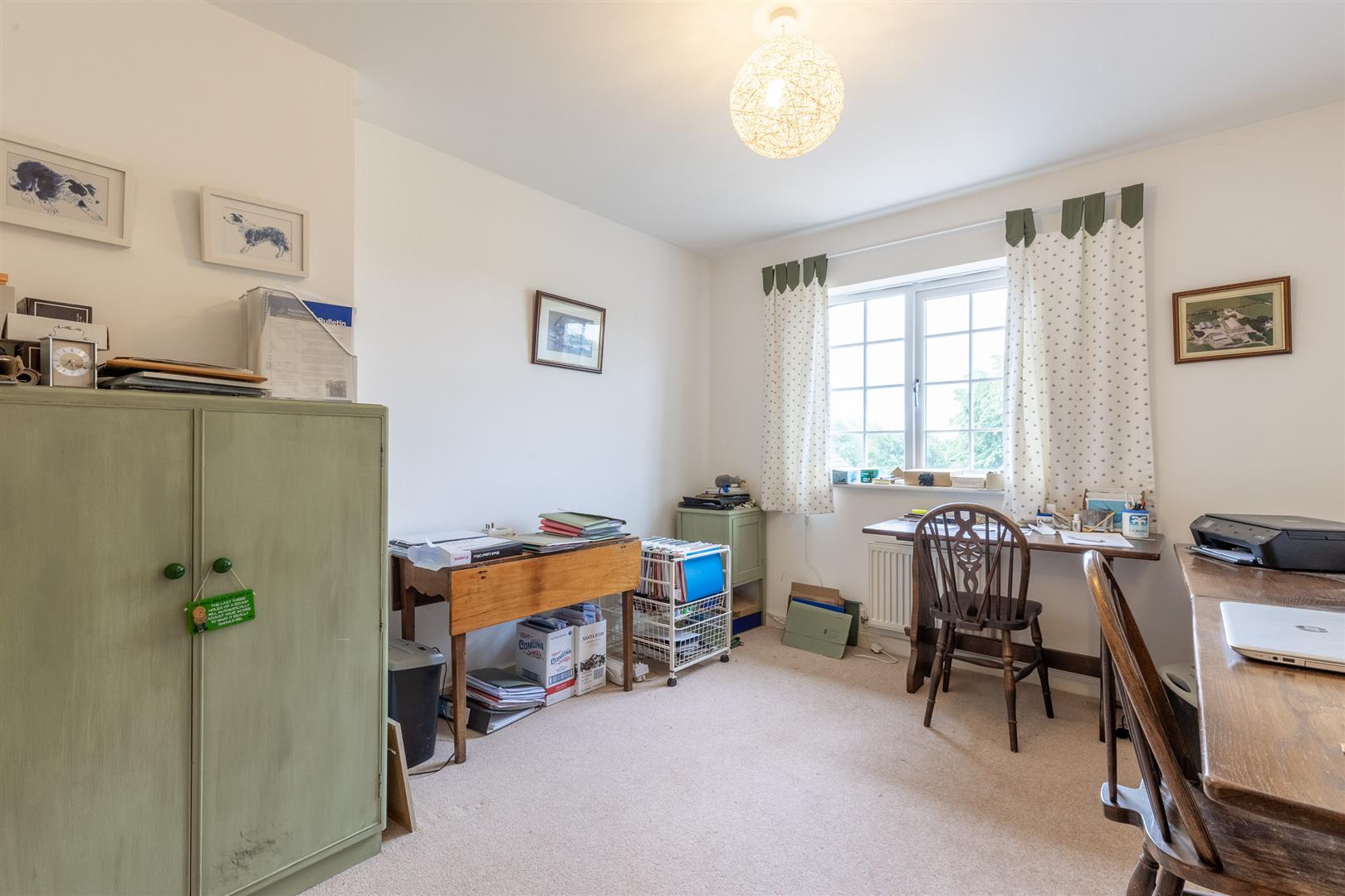 The south-facing rear garden with an irrigation system includes two patio areas, a gravelled section, and established planting with shrubs, flowers, and mature planters. The garden is enclosed by a combination of wooden fencing and wrought iron fencing, and enjoys views over the first hole of Wychwood Park’s golf course. Gated side access is available.