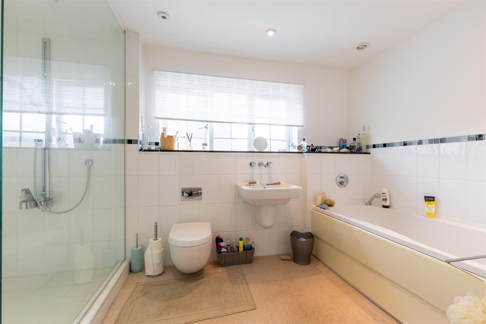 The first-floor landing is carpeted and includes a radiator, access to the airing cupboard, and storage space. The master bedroom has carpeted flooring, a radiator, pendant light, and double glazed French doors opening onto a balcony with views over the golf course. A walk-in wardrobe features carpeted flooring, four sliding built-in wardrobes, spot lighting, and a radiator. The en-suite comprises a walk-in shower with fully tiled walls and glass screen, panelled bath, low flush W/C, sink, radiator, frosted double glazed window to the front, carpeted flooring, spot lights, and half tiled walls. Bedroom two has two built-in wardrobes, carpeted flooring, radiator, pendant light, and a double glazed window to the front. Its en-suite includes a shower cubicle with fully tiled walls and glass screen, low flush W/C, sink, radiator, carpeted flooring, spot lights, extractor fan, half tiled walls, and a frosted window to the front. Bedroom three includes a side aspect double glazed window, carpeted flooring, radiator, and ceiling light. Bedroom four has a double glazed window to the rear, carpeted flooring, radiator, and ceiling light. The family bathroom features a panelled bath, shower cubicle with fully tiled walls and glass screen, low flush W/C, sink, frosted side aspect window, half tiled walls, carpeted flooring, spot lights, radiator, and extractor fan.