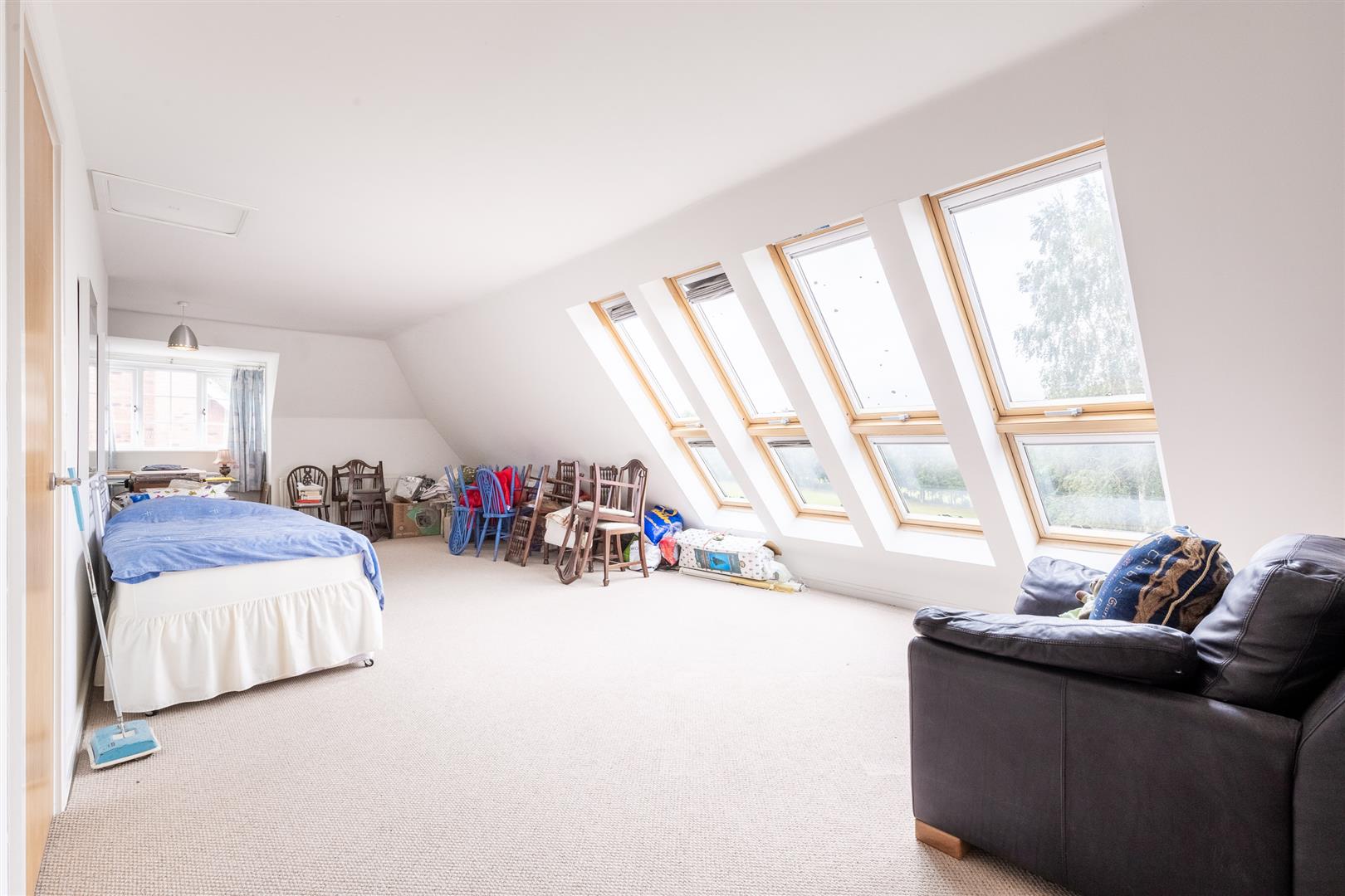 The second-floor landing includes carpeted flooring, pendant light, and access to a large carpeted storage cupboard with wall light. Bedroom five/entertainment room features carpeted flooring, eight Velux windows with integrated blinds offering elevated views across the golf course, an additional rear-facing double glazed window, two radiators, pendant lights, and loft access. The Worcester boiler is housed in a separate boiler cupboard.
