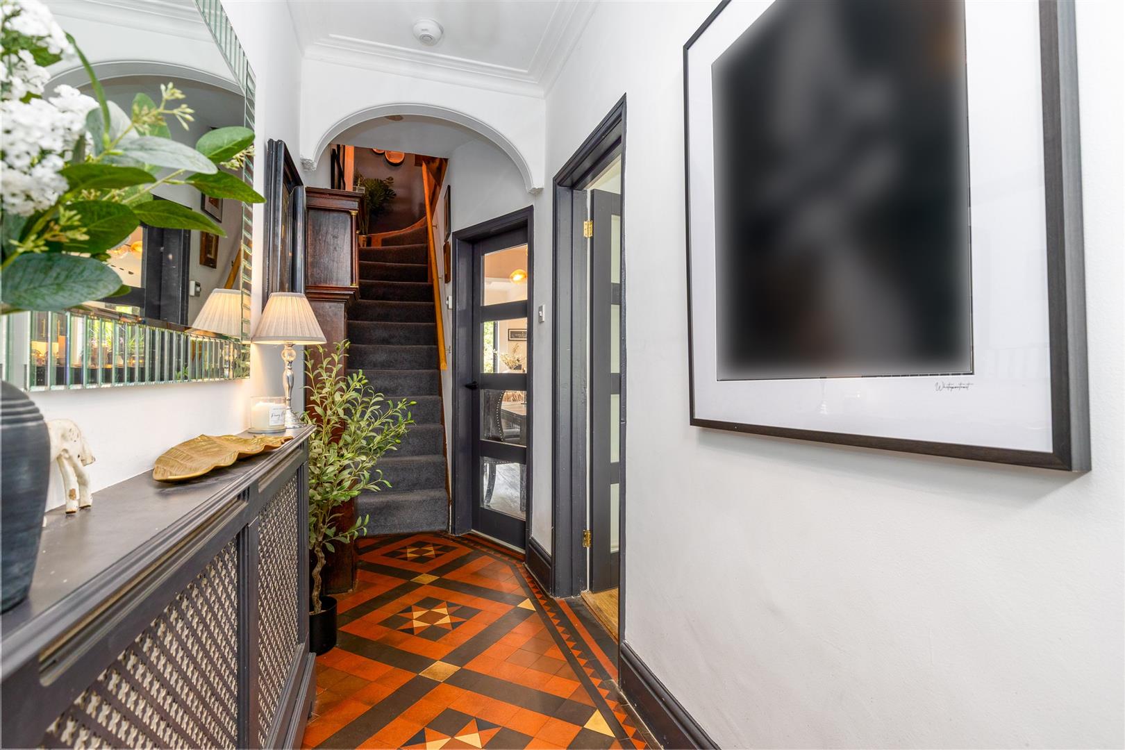 Dimensions: 4.47m x 1.14m (14'8" x 3'9"). Original Minton tiled tiled floor, composite entrance door, ceiling cornices, radiator with cover.