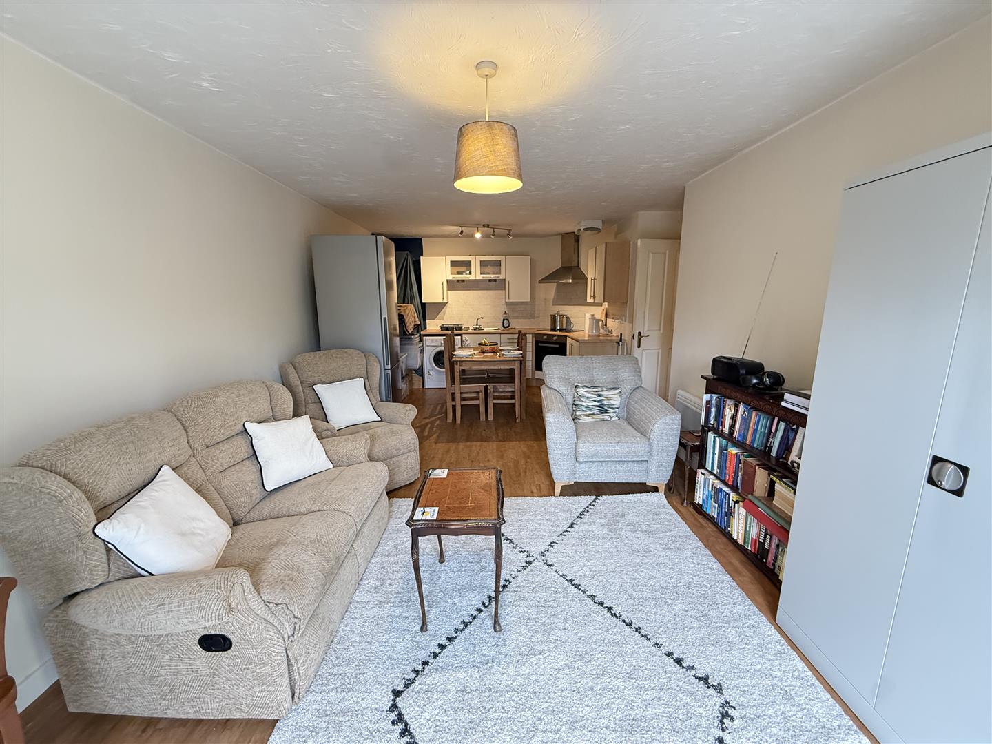 The entrance opens into a spacious open-plan kitchen and living area, providing an ideal space for modern living and dining. The room benefits from multiple windows allowing plenty of natural light. The kitchen is fitted with a range of units and work surfaces, with space for appliances and ample storage. There are two generous double bedrooms, each offering space for furniture and storage. The family bathroom features a panelled bath, separate shower cubicle, wash hand basin, and low flush W/C.