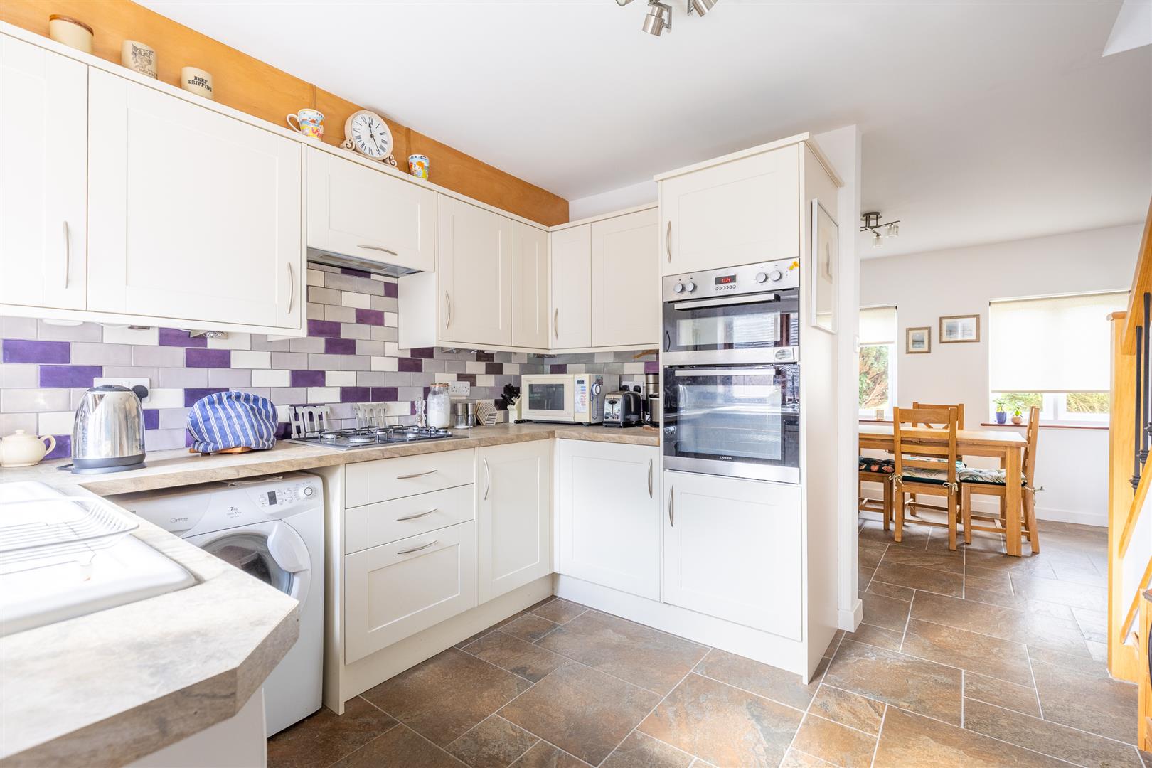 Enamel single drainer sink unit, cupboard under, floor standing cupboard and drawer units with worktops, wall cupboards, integrated oven and grill, four burner hob unit with extractor hood above, plumbing for dishwasher and washing machine, tiled floor, underfloor heating.