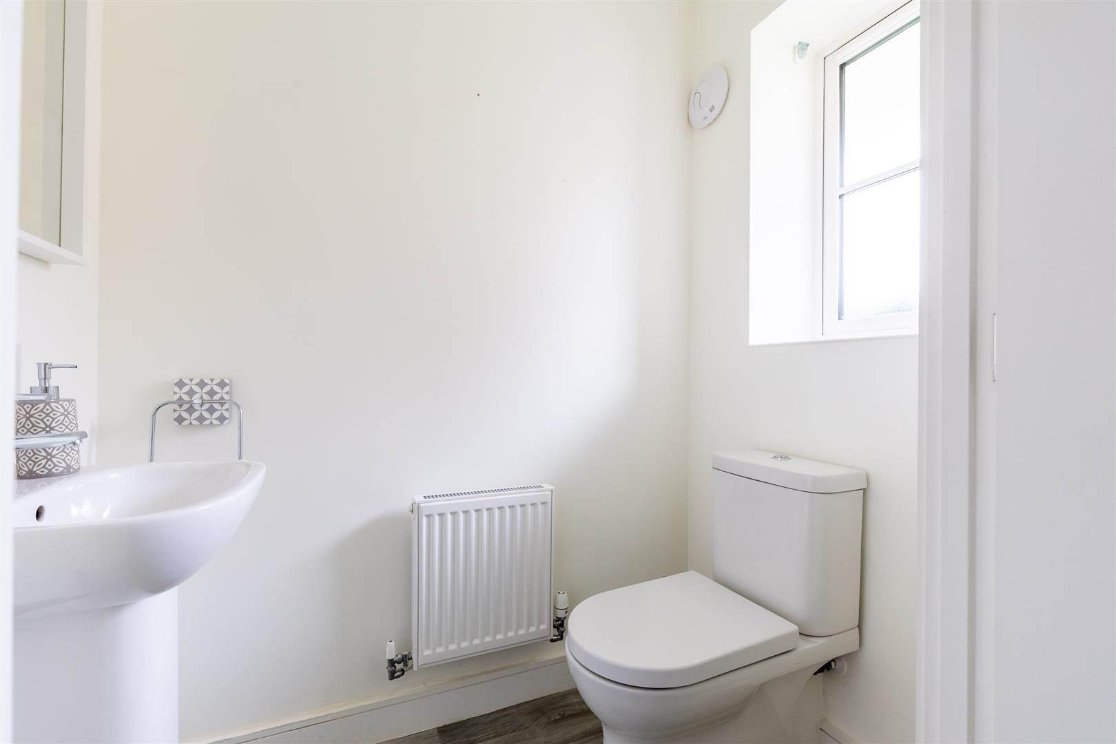 White suite comprising low flush W/C and pedestal hand basin, wood laminate floor, radiator.