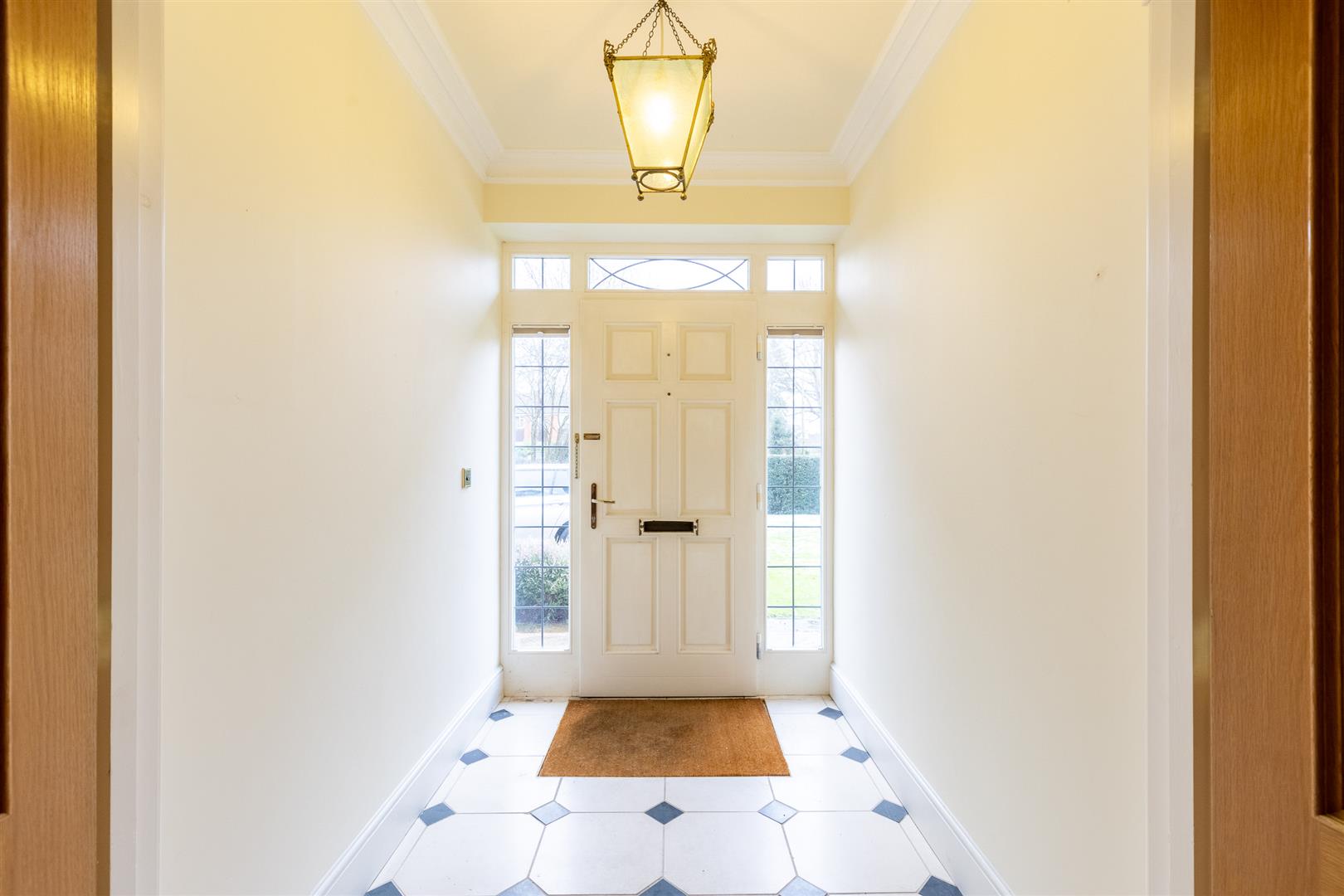 Dimensions: 4.27m x 3.86m (14'0" x 12'8"). Ceramic tiled floor, light oak staircase, ceiling cornices, chandelier-style light, understairs storage cupboard, and alarm.