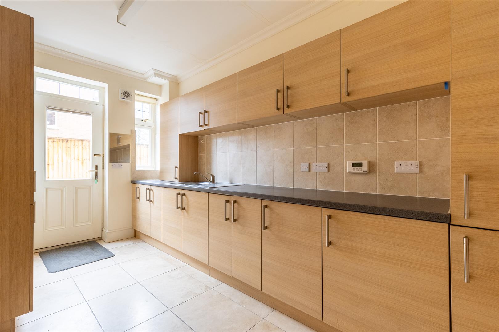 Dimensions: 4.62m x 2.49m (15'2" x 8'2"). The large utility comprises of a stainless steel sink, wooden laminate cupboards above and below counter, plumbing for washing machine and dryer, extractor fan, ceramic floor, back door, double glazed window and a wall mounted gas fired boiler.