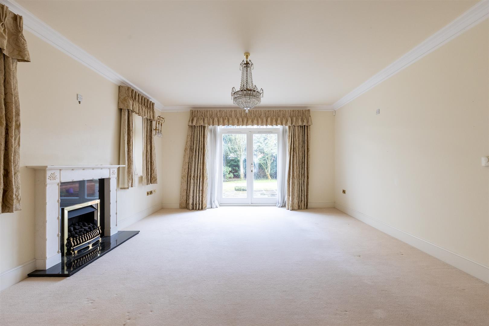 Dimensions: 5.66m x 4.62m (18'7" x 15'2"). Marble gas-coal effect fireplace, two wall-mounted lights, chandelier-style light, double-glazed windows and patio doors to the garden.