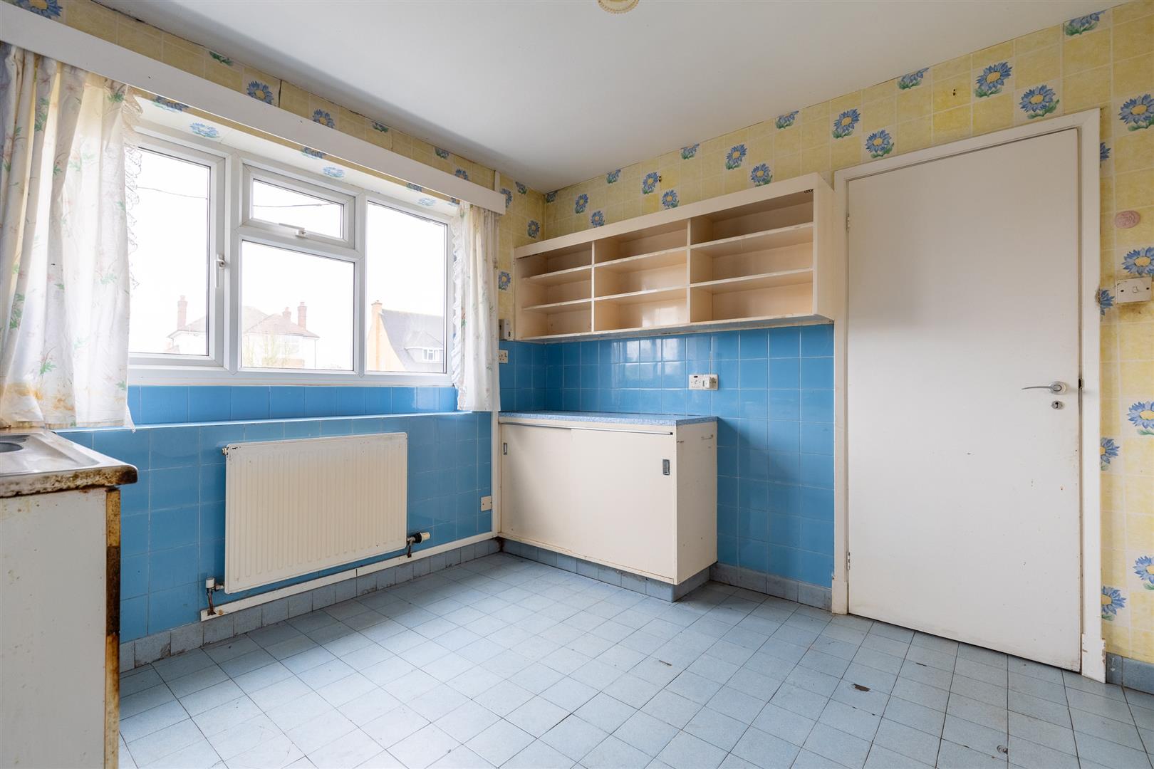 Dimensions: 3.43m x 3.30m (11'3" x 10'10"). Stainless steel single drainer sink unit, cupboards under, fitted cupboards and drawers, tiled floor, part tiled walls, radiator.