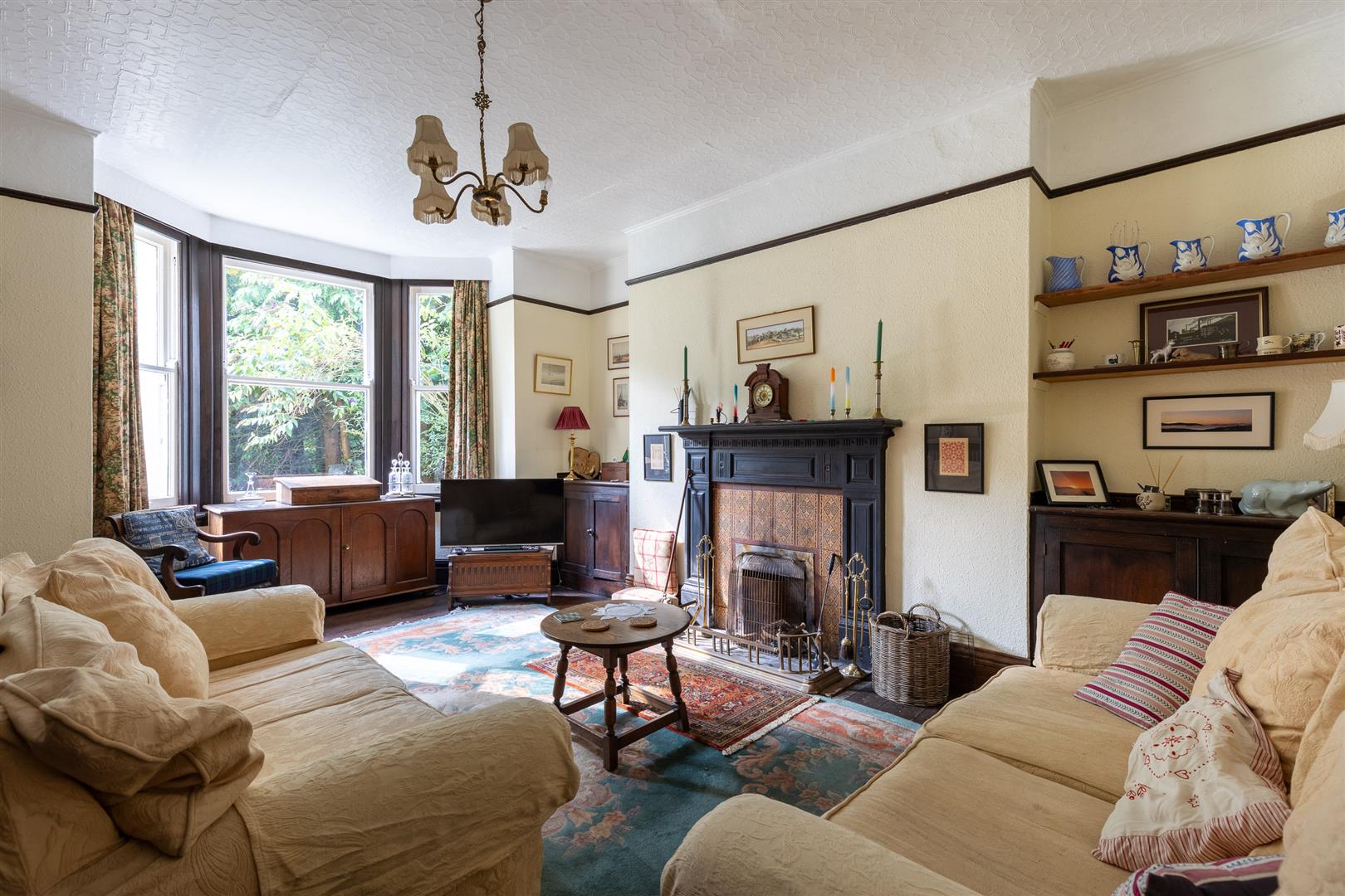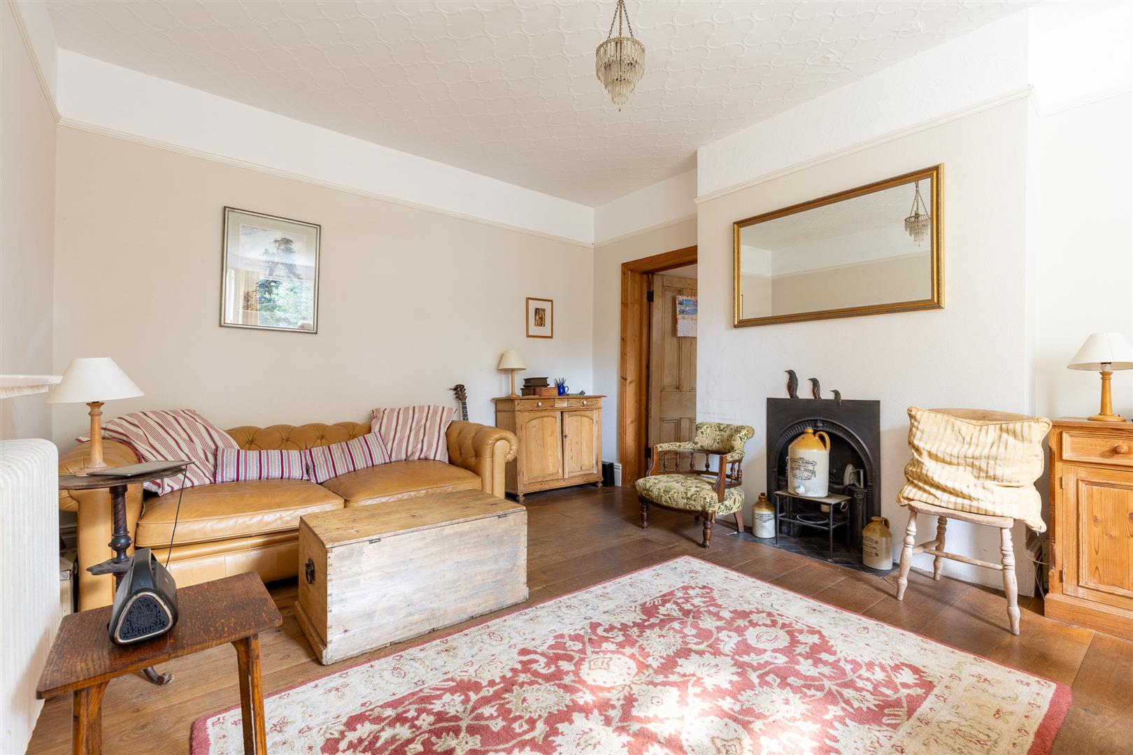 Dimensions: 5.89m x 4.29m (19'4" x 14'1"). Triple sash bay window, exposed oak boarded floor, Adam style cast fire surround with tile inlay and open grate, two built in China cupboards, cast column radiator, picture rail.