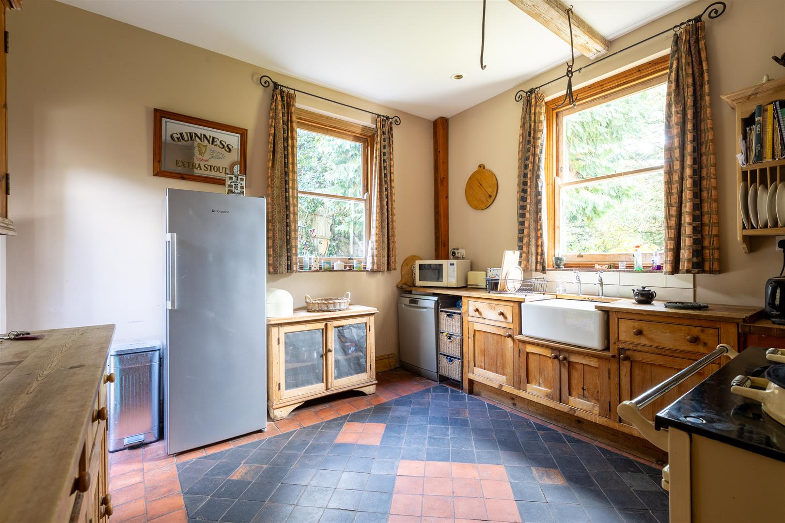 Dimensions: 3.78m x 3.61m (12'5" x 11'10"). Fitted solid pine units to two elevations complemented with free standing character furniture. Solid wood worktop surface with white glazed undermounted traditional sink and tiled splash back. Authentic two oven oil fired AGA range set in a black and white tiled alcove with an oak over mantle, two sash windows, undercounter spaces for appliances, feature quarry tile floor.